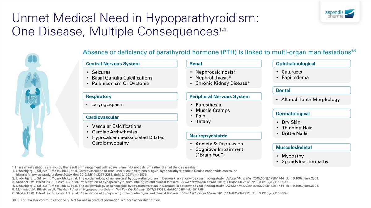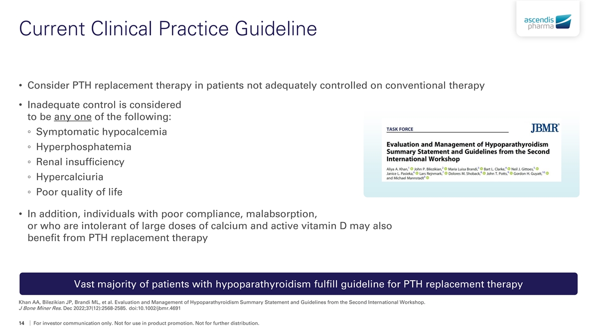 Unmet Medical Need in Hypoparathyroidism: 1-4 One Disease, Multiple Consequences 5,6 Absence or deficiency of parathyroid hormone (PTH) is linked to multi-organ manifestations Central Nervous System Renal Ophthalmological • Nephrocalcinosis*• Cataracts • Seizures • Papilledema • Basal Ganglia Calcifications• Nephrolithiasis* • Chronic Kidney Disease* • Parkinsonism Or Dystonia Dental Respiratory Peripheral Nervous System • Altered Tooth Morphology • Laryngospasm • Paresthesia • Muscle Cramps Dermatological • Pain Cardiovascular • Tetany • Dry Skin • Vascular Calcifications • Thinning Hair • Cardiac Arrhythmias • Brittle Nails Neuropsychiatric • Hypocalcemia-associated Dilated Cardiomyopathy • Anxiety & Depression Musculoskeletal • Cognitive Impairment (“Brain Fog”) • Myopathy • Spondyloarthropathy * These manifestations are mostly the result of management with active vitamin D and calcium rather than of the disease itself. 1. Underbjerg L, Sikjaer T, Mosekilde L, et al. Cardiovascular and renal complications to postsurgical hypoparathyroidism: a Danish nationwide controlled historic follow-up study. J Bone Miner Res. 2013;28(11):2277-2285. doi:10.1002/jbmr.1979. 2. Underbjerg L, Sikjaer T, Mosekilde L, et al. The epidemiology of nonsurgical hypoparathyroidism in Denmark: a nationwide case finding study. J Bone Miner Res. 2015;30(9):1738-1744. doi:10.1002/jbmr.2501. 3. Shoback DM, Bilezikian JP, Costa AG, et al. Presentation of hypoparathyroidism: etiologies and clinical features. J Clin Endocrinol Metab. 2016;101(6):2300-2312. doi:10.1210/jc.2015-3909. 4. Underbjerg L, Sikjaer T, Mosekilde L, et al. The epidemiology of nonsurgical hypoparathyroidism in Denmark: a nationwide case finding study. J Bone Miner Res. 2015;30(9):1738-1744. doi:10.1002/jbmr.2501. 5. Mannstadt M, Bilezikian JP, Thakker RV, et al. Hypoparathyroidism. Nat Rev Dis Primers. 2017;3:17055. doi:10.1038/nrdp.2017.55. 6. Shoback DM, Bilezikian JP, Costa AG, et al. Presentation of hypoparathyroidism: etiologies and clinical features. J Clin Endocrinol Metab. 2016;101(6):2300-2312. doi:10.1210/jc.2015-3909. 13 For investor communication only. Not for use in product promotion. Not for further distribution.