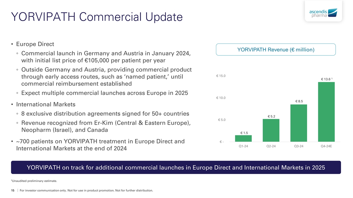 YORVIPATH Commercial Update • Europe Direct YORVIPATH Revenue (€ million) ◦ Commercial launch in Germany and Austria in January 2024, with initial list price of €105,000 per patient per year ◦ Outside Germany and Austria, providing commercial product € 15.0 through early access routes, such as ‘named patient,’ until 1 € 13.6 commercial reimbursement established ◦ Expect multiple commercial launches across Europe in 2025 € 10.0 € 8.5 • International Markets ◦ 8 exclusive distribution agreements signed for 50+ countries € 5.2 € 5.0 ◦ Revenue recognized from Er-Kim (Central & Eastern Europe), Neopharm (Israel), and Canada € 1.5 € - • ~700 patients on YORVIPATH treatment in Europe Direct and Q1-24 Q2-24 Q3-24 Q4-24E International Markets at the end of 2024 YORVIPATH on track for additional commercial launches in Europe Direct and International Markets in 2025 1 Unaudited preliminary estimate. 15 For investor communication only. Not for use in product promotion. Not for further distribution.