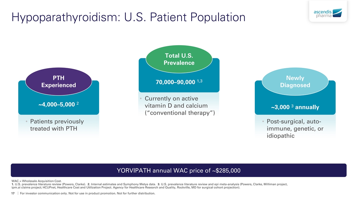 ® YORVIPATH U.S. FDA Approved and Now Commercially Available • YORVIPATH is the first and only product indicated for the treatment of 1 hypoparathyroidism in adults • Commercially available in the U.S. December 2024 1. Limitations of Use: YORVIPATH was not studied for acute post-surgical hypoparathyroidism. YORVIPATH’s titration scheme was only evaluated in adults who first achieved an albumin-corrected serum calcium of at least 7.8 mg/dL using calcium and active vitamin D treatment. YORVIPATH [package insert]. Princeton, NJ: Ascendis Pharma Endocrinology, Inc. August 2024. 16 For investor communication only. Not for use in product promotion. Not for further distribution.