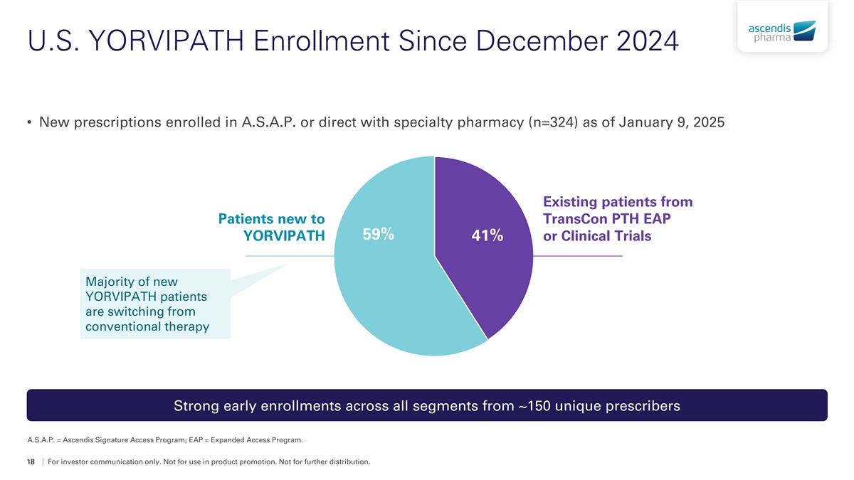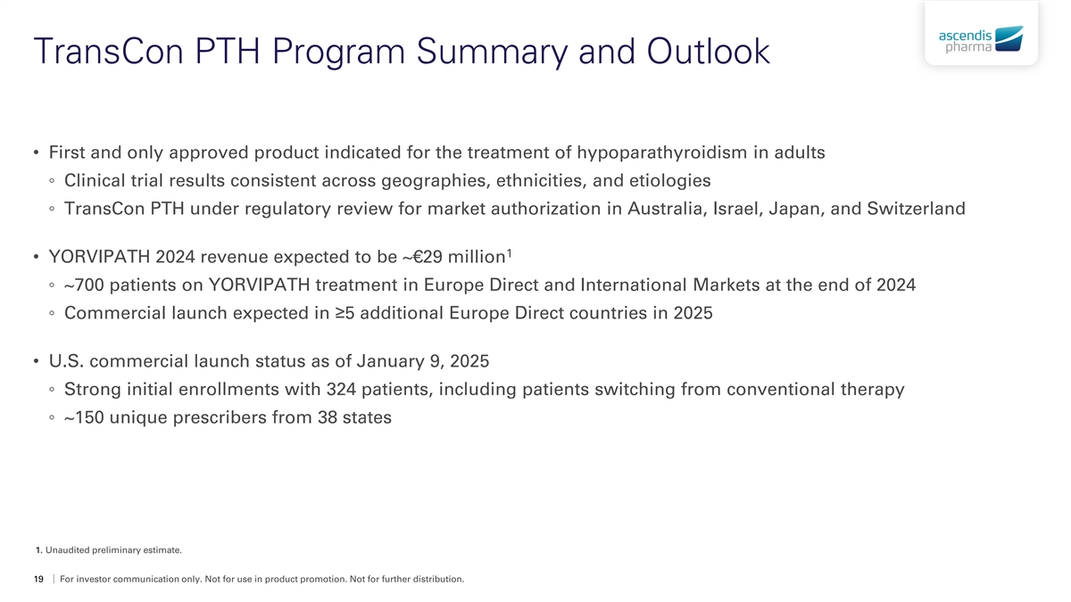 U.S. YORVIPATH Enrollment Since December 2024 • New prescriptions enrolled in A.S.A.P. or direct with specialty pharmacy (n=324) as of January 9, 2025 Existing patients from Patients new to TransCon PTH EAP 59% YORVIPATH 41% or Clinical Trials Majority of new YORVIPATH patients are switching from conventional therapy Strong early enrollments across all segments from ~150 unique prescribers A.S.A.P. = Ascendis Signature Access Program; EAP = Expanded Access Program. 18 For investor communication only. Not for use in product promotion. Not for further distribution.
