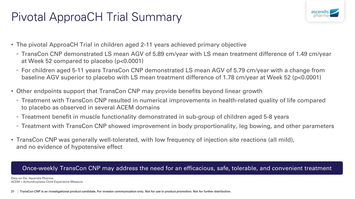 Pivotal ApproaCH Trial Summary • The pivotal ApproaCH Trial in children aged 2-11 years achieved primary objective ◦ TransCon CNP demonstrated LS mean AGV of 5.89 cm/year with LS mean treatment difference of 1.49 cm/year at Week 52 compared to placebo (p<0.0001) ◦ For children aged 5-11 years TransCon CNP demonstrated LS mean AGV of 5.79 cm/year with a change from baseline AGV superior to placebo with LS mean treatment difference of 1.78 cm/year at Week 52 (p<0.0001) • Other endpoints support that TransCon CNP may provide benefits beyond linear growth ◦ Treatment with TransCon CNP resulted in numerical improvements in health-related quality of life compared to placebo as observed in several ACEM domains ◦ Treatment benefit in muscle functionality demonstrated in sub-group of children aged 5-8 years ◦ Treatment with TransCon CNP showed improvement in body proportionality, leg bowing, and other parameters • TransCon CNP was generally well-tolerated, with low frequency of injection site reactions (all mild), and no evidence of hypotensive effect Once-weekly TransCon CNP may address the need for an efficacious, safe, tolerable, and convenient treatment Data on file. Ascendis Pharma. ACEM = Achondroplasia Child Experience Measure. 21 TransCon CNP is an investigational product candidate. For investor communication only. Not for use in product promotion. Not for further distribution.