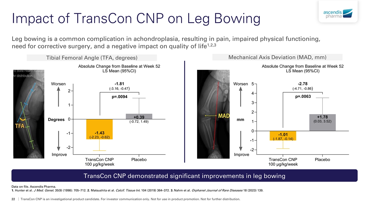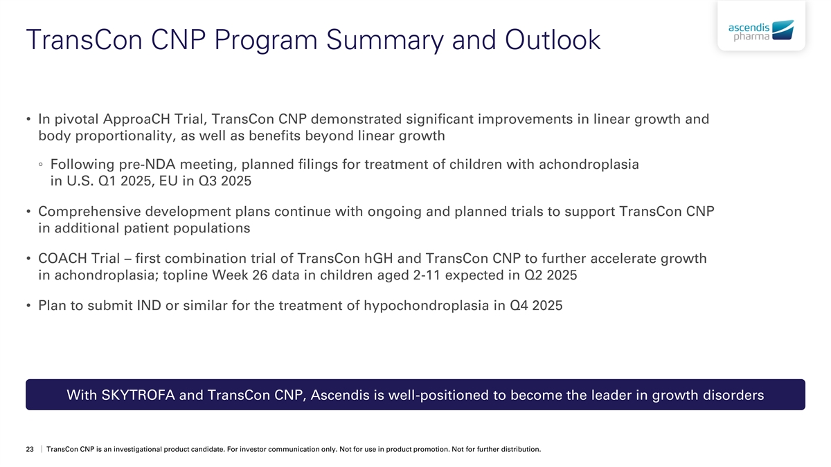 Impact of TransCon CNP on Leg Bowing Leg bowing is a common complication in achondroplasia, resulting in pain, impaired physical functioning, 1,2,3 need for corrective surgery, and a negative impact on quality of life Mechanical Axis Deviation (MAD, mm) Tibial Femoral Angle (TFA, degrees) Absolute Change from Baseline at Week 52 Absolute Change from Baseline at Week 52 LS Mean (95%CI) LS Mean (95%CI) -1.81 -2.78 Worsen Worsen 5 (-3.16, -0.47) (-4.71, -0.86) 2 4 p=.0063 p=.0094 3 1 2 +1.78 +0.39 0 Degrees mm (0.03, 3.52) (-0.72, 1.49) 1 0 -1.43 -1 -1.01 (-2.23, -0.62) (-1.87, -0.14) -1 -2 -2 Improve Improve TransCon CNP Placebo TransCon CNP Placebo 100 μg/kg/week 100 μg/kg/week TransCon CNP demonstrated significant improvements in leg bowing Data on file. Ascendis Pharma. 1. Hunter et al. J Med. Genet. 35(9) (1998): 705–712. 2. Matsushita et al. Calcif. Tissue Int. 104 (2019) 364–372. 3. Nahm et al. Orphanet Journal of Rare Diseases 18 (2023) 139. 22 TransCon CNP is an investigational product candidate. For investor communication only. Not for use in product promotion. Not for further distribution.