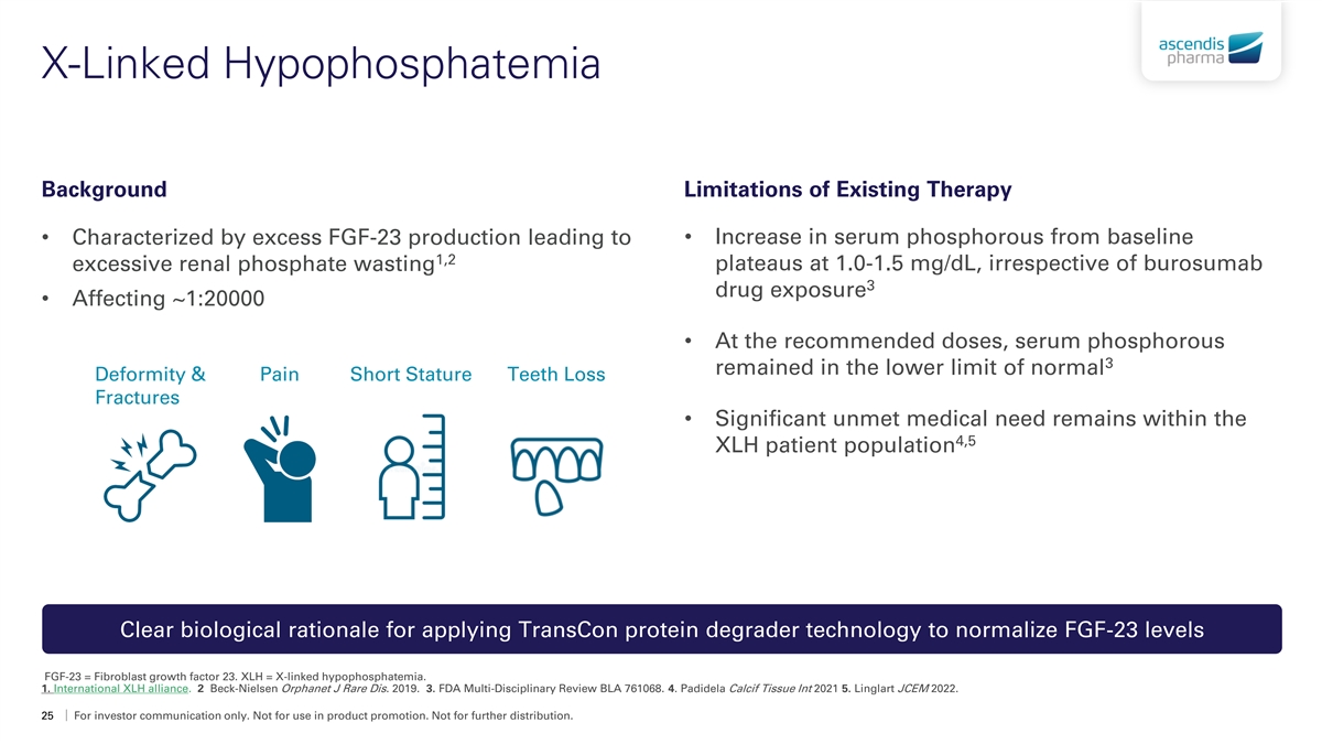 X-Linked Hypophosphatemia Background Limitations of Existing Therapy • Increase in serum phosphorous from baseline • Characterized by excess FGF-23 production leading to 1,2 plateaus at 1.0-1.5 mg/dL, irrespective of burosumab excessive renal phosphate wasting 3 drug exposure • Affecting ~1:20000 • At the recommended doses, serum phosphorous 3 remained in the lower limit of normal Deformity & Pain Short Stature Teeth Loss Fractures • Significant unmet medical need remains within the 4,5 XLH patient population Clear biological rationale for applying TransCon protein degrader technology to normalize FGF-23 levels FGF-23 = Fibroblast growth factor 23. XLH = X-linked hypophosphatemia. 1. International XLH alliance. 2 Beck-Nielsen Orphanet J Rare Dis. 2019. 3. FDA Multi-Disciplinary Review BLA 761068. 4. Padidela Calcif Tissue Int 2021 5. Linglart JCEM 2022. 25 For investor communication only. Not for use in product promotion. Not for further distribution.
