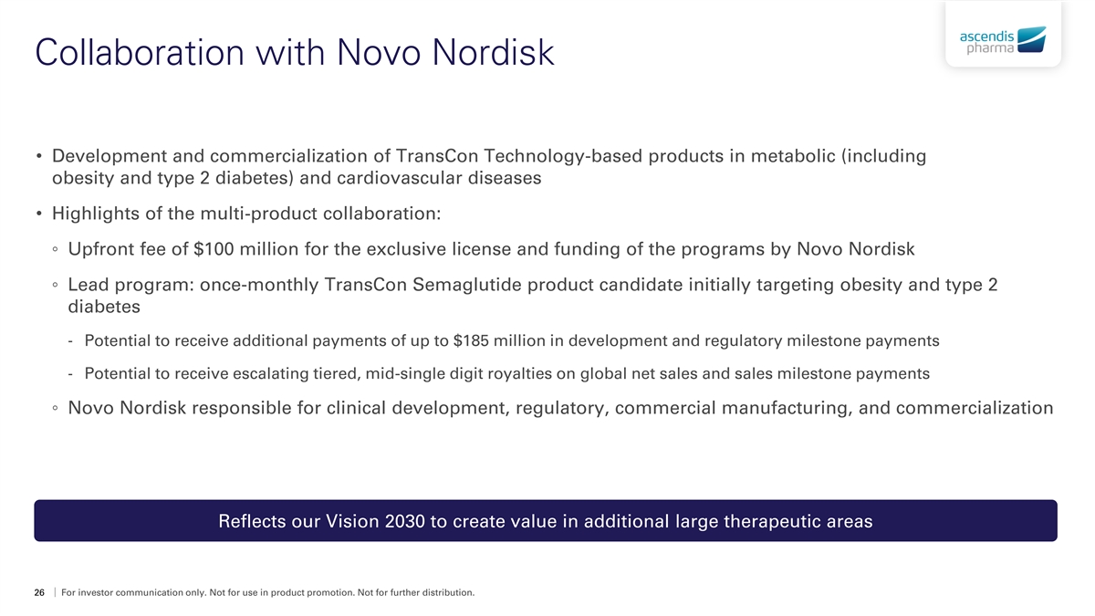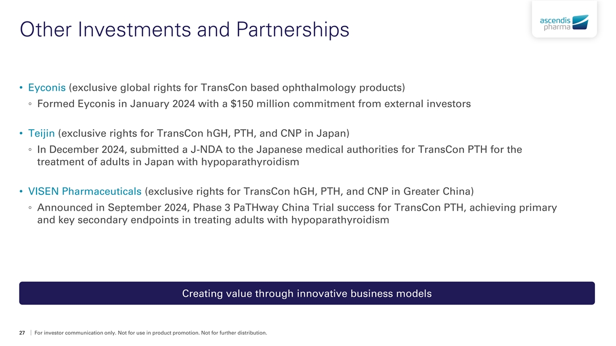 Collaboration with Novo Nordisk • Development and commercialization of TransCon Technology-based products in metabolic (including obesity and type 2 diabetes) and cardiovascular diseases • Highlights of the multi-product collaboration: ◦ Upfront fee of $100 million for the exclusive license and funding of the programs by Novo Nordisk ◦ Lead program: once-monthly TransCon Semaglutide product candidate initially targeting obesity and type 2 diabetes - Potential to receive additional payments of up to $185 million in development and regulatory milestone payments - Potential to receive escalating tiered, mid-single digit royalties on global net sales and sales milestone payments ◦ Novo Nordisk responsible for clinical development, regulatory, commercial manufacturing, and commercialization Reflects our Vision 2030 to create value in additional large therapeutic areas 26 For investor communication only. Not for use in product promotion. Not for further distribution.