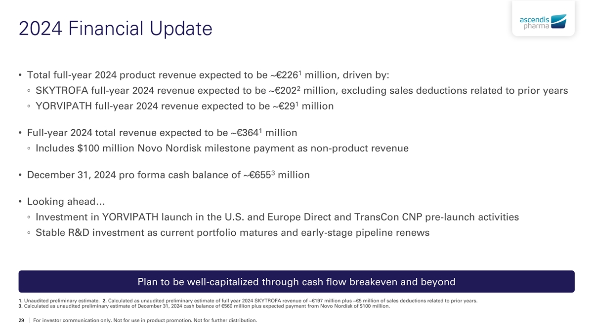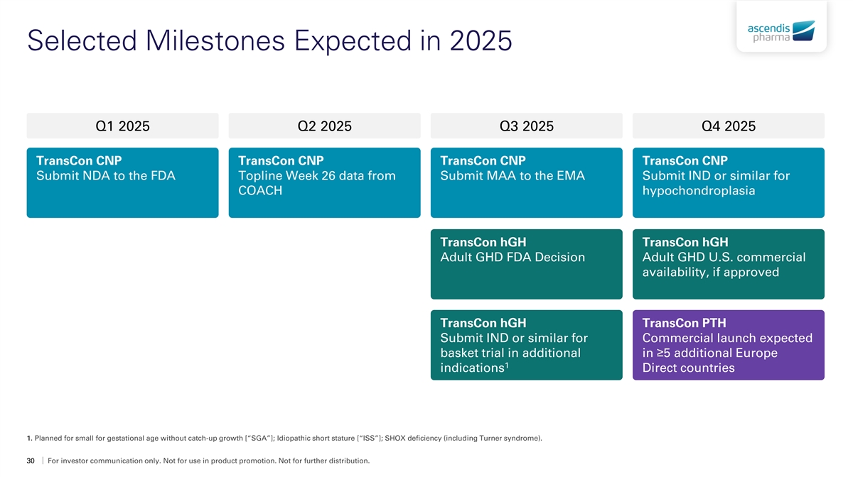 2024 Financial Update 1 • Total full-year 2024 product revenue expected to be ~€226 million, driven by: 2 ◦ SKYTROFA full-year 2024 revenue expected to be ~€202 million, excluding sales deductions related to prior years 1 ◦ YORVIPATH full-year 2024 revenue expected to be ~€29 million 1 • Full-year 2024 total revenue expected to be ~€364 million ◦ Includes $100 million Novo Nordisk milestone payment as non-product revenue 3 • December 31, 2024 pro forma cash balance of ~€655 million • Looking ahead… ◦ Investment in YORVIPATH launch in the U.S. and Europe Direct and TransCon CNP pre-launch activities ◦ Stable R&D investment as current portfolio matures and early-stage pipeline renews Plan to be well-capitalized through cash flow breakeven and beyond 1. Unaudited preliminary estimate. 2. Calculated as unaudited preliminary estimate of full year 2024 SKYTROFA revenue of ~€197 million plus ~€5 million of sales deductions related to prior years. 3. Calculated as unaudited preliminary estimate of December 31, 2024 cash balance of €560 million plus expected payment from Novo Nordisk of $100 million. 29 For investor communication only. Not for use in product promotion. Not for further distribution.