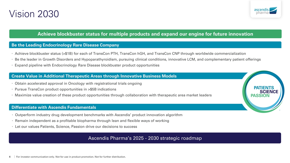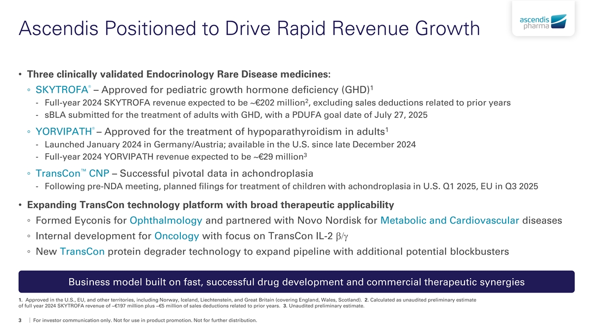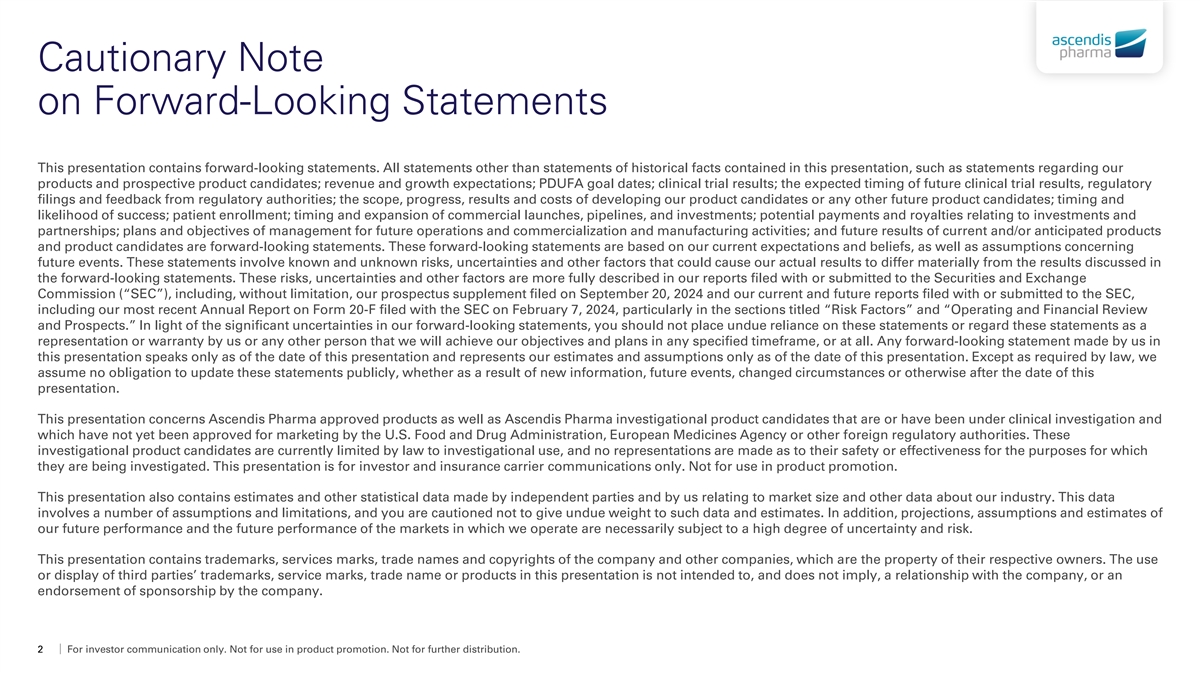Cautionary Note on Forward-Looking Statements This presentation contains forward-looking statements. All statements other than statements of historical facts contained in this presentation, such as statements regarding our products and prospective product candidates; revenue and growth expectations; PDUFA goal dates; clinical trial results; the expected timing of future clinical trial results, regulatory filings and feedback from regulatory authorities; the scope, progress, results and costs of developing our product candidates or any other future product candidates; timing and likelihood of success; patient enrollment; timing and expansion of commercial launches, pipelines, and investments; potential payments and royalties relating to investments and partnerships; plans and objectives of management for future operations and commercialization and manufacturing activities; and future results of current and/or anticipated products and product candidates are forward-looking statements. These forward-looking statements are based on our current expectations and beliefs, as well as assumptions concerning future events. These statements involve known and unknown risks, uncertainties and other factors that could cause our actual results to differ materially from the results discussed in the forward-looking statements. These risks, uncertainties and other factors are more fully described in our reports filed with or submitted to the Securities and Exchange Commission (“SEC”), including, without limitation, our prospectus supplement filed on September 20, 2024 and our current and future reports filed with or submitted to the SEC, including our most recent Annual Report on Form 20-F filed with the SEC on February 7, 2024, particularly in the sections titled “Risk Factors” and “Operating and Financial Review and Prospects.” In light of the significant uncertainties in our forward-looking statements, you should not place undue reliance on these statements or regard these statements as a representation or warranty by us or any other person that we will achieve our objectives and plans in any specified timeframe, or at all. Any forward-looking statement made by us in this presentation speaks only as of the date of this presentation and represents our estimates and assumptions only as of the date of this presentation. Except as required by law, we assume no obligation to update these statements publicly, whether as a result of new information, future events, changed circumstances or otherwise after the date of this presentation. This presentation concerns Ascendis Pharma approved products as well as Ascendis Pharma investigational product candidates that are or have been under clinical investigation and which have not yet been approved for marketing by the U.S. Food and Drug Administration, European Medicines Agency or other foreign regulatory authorities. These investigational product candidates are currently limited by law to investigational use, and no representations are made as to their safety or effectiveness for the purposes for which they are being investigated. This presentation is for investor and insurance carrier communications only. Not for use in product promotion. This presentation also contains estimates and other statistical data made by independent parties and by us relating to market size and other data about our industry. This data involves a number of assumptions and limitations, and you are cautioned not to give undue weight to such data and estimates. In addition, projections, assumptions and estimates of our future performance and the future performance of the markets in which we operate are necessarily subject to a high degree of uncertainty and risk. This presentation contains trademarks, services marks, trade names and copyrights of the company and other companies, which are the property of their respective owners. The use or display of third parties’ trademarks, service marks, trade name or products in this presentation is not intended to, and does not imply, a relationship with the company, or an endorsement of sponsorship by the company. 2 For investor communication only. Not for use in product promotion. Not for further distribution.