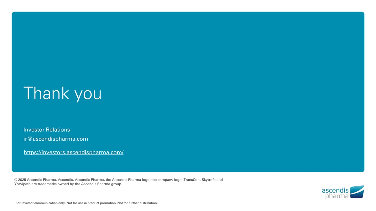 Thank you Investor Relations ir@ascendispharma.com https://investors.ascendispharma.com/ © 2025 Ascendis Pharma. Ascendis, Ascendis Pharma, the Ascendis Pharma logo, the company logo, TransCon, Skytrofa and Yorvipath are trademarks owned by the Ascendis Pharma group. For investor communication only. Not for use in product promotion. Not for further distribution.