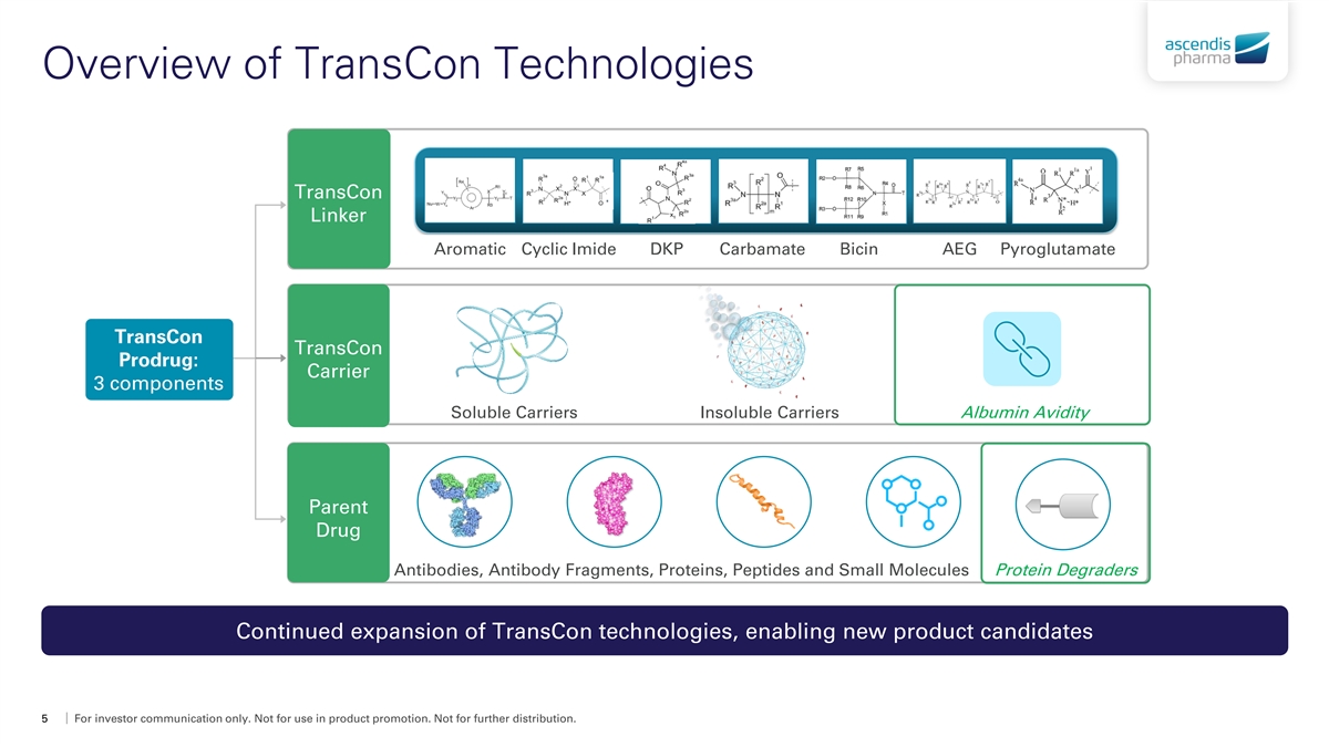 Vision 2030 Achieve blockbuster status for multiple products and expand our engine for future innovation Be the Leading Endocrinology Rare Disease Company • Achieve blockbuster status (>$1B) for each of TransCon PTH, TransCon hGH, and TransCon CNP through worldwide commercialization • Be the leader in Growth Disorders and Hypoparathyroidism, pursuing clinical conditions, innovative LCM, and complementary patient offerings • Expand pipeline with Endocrinology Rare Disease blockbuster product opportunities Create Value in Additional Therapeutic Areas through Innovative Business Models • Obtain accelerated approval in Oncology with registrational trials ongoing • Pursue TransCon product opportunities in >$5B indications • Maximize value creation of these product opportunities through collaboration with therapeutic area market leaders Differentiate with Ascendis Fundamentals • Outperform industry drug development benchmarks with Ascendis’ product innovation algorithm • Remain independent as a profitable biopharma through lean and flexible ways of working • Let our values Patients, Science, Passion drive our decisions to success Ascendis Pharma’s 2025 - 2030 strategic roadmap 4 For investor communication only. Not for use in product promotion. Not for further distribution.