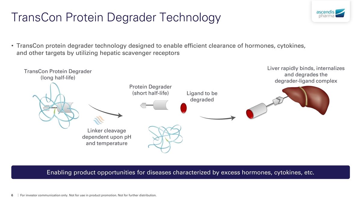 Overview of TransCon Technologies TransCon Linker Aromatic Cyclic Imide DKP Carbamate Bicin AEG Pyroglutamate TransCon TransCon Prodrug: Carrier 3 components Soluble Carriers Insoluble Carriers Albumin Avidity Parent Drug Antibodies, Antibody Fragments, Proteins, Peptides and Small Molecules Protein Degraders Continued expansion of TransCon technologies, enabling new product candidates 5 For investor communication only. Not for use in product promotion. Not for further distribution.