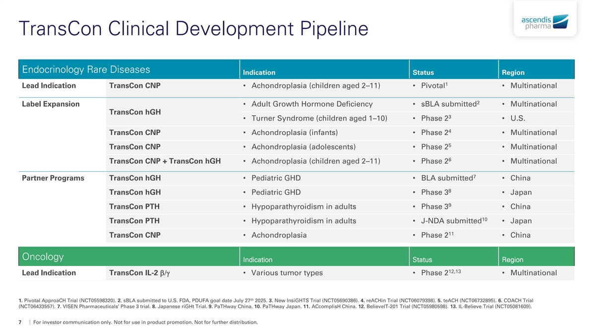 TransCon Protein Degrader Technology • TransCon protein degrader technology designed to enable efficient clearance of hormones, cytokines, and other targets by utilizing hepatic scavenger receptors Liver rapidly binds, internalizes TransCon Protein Degrader and degrades the (long half-life) degrader-ligand complex Protein Degrader (short half-life) Ligand to be degraded Linker cleavage dependent upon pH and temperature Enabling product opportunities for diseases characterized by excess hormones, cytokines, etc. 6 For investor communication only. Not for use in product promotion. Not for further distribution.
