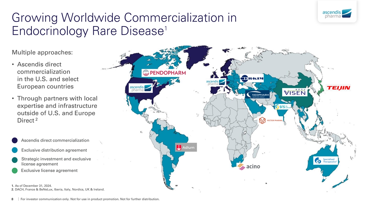 Growing Worldwide Commercialization in 1 Endocrinology Rare Disease Multiple approaches: • Ascendis direct commercialization in the U.S. and select European countries • Through partners with local expertise and infrastructure outside of U.S. and Europe 2 Direct Ascendis direct commercialization Exclusive distribution agreement Strategic investment and exclusive license agreement Exclusive license agreement 1. As of December 31, 2024. 2. DACH, France & BeNeLux, Iberia, Italy, Nordics, UK & Ireland. 8 For investor communication only. Not for use in product promotion. Not for further distribution.
