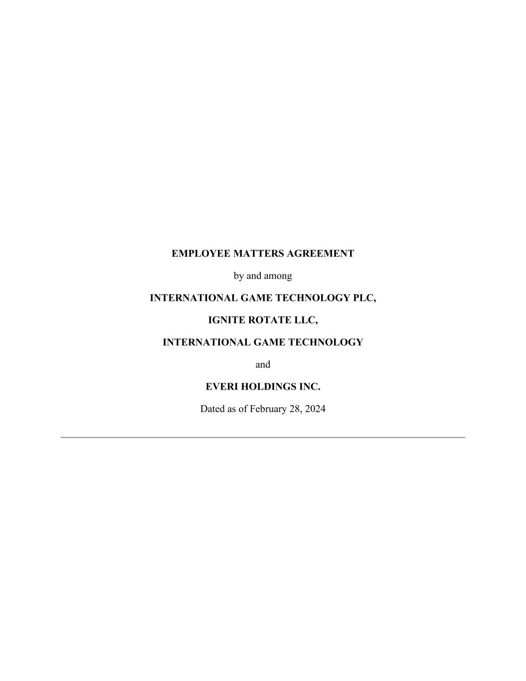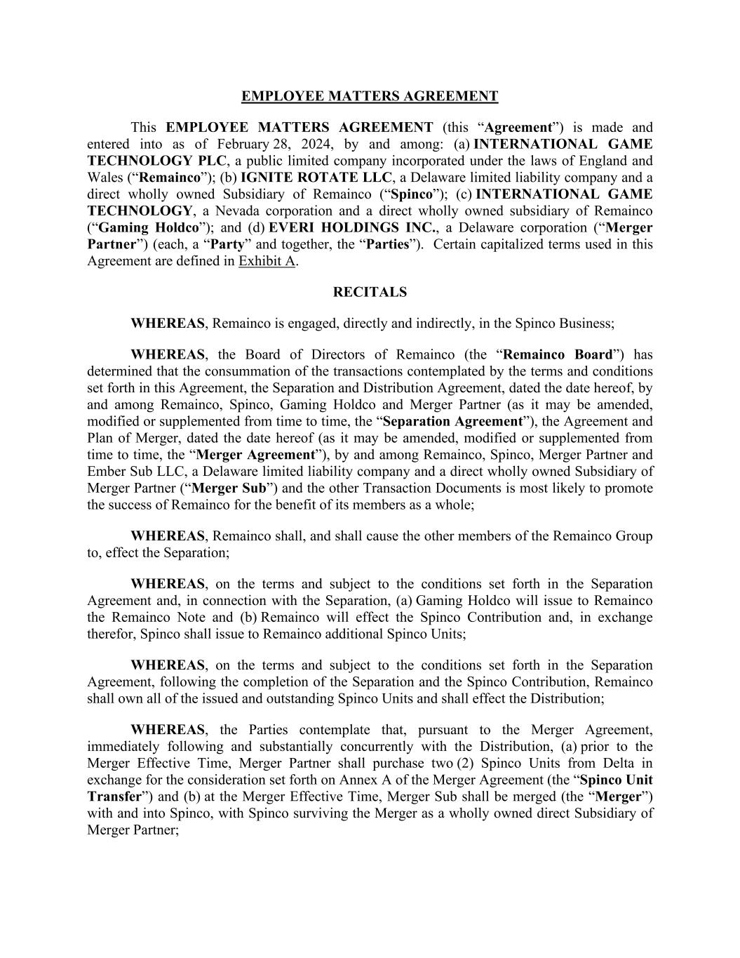 EMPLOYEE MATTERS AGREEMENT This EMPLOYEE MATTERS AGREEMENT (this “Agreement”) is made and entered into as of February 28, 2024, by and among: (a) INTERNATIONAL GAME TECHNOLOGY PLC, a public limited company incorporated under the laws of England and Wales (“Remainco”); (b) IGNITE ROTATE LLC, a Delaware limited liability company and a direct wholly owned Subsidiary of Remainco (“Spinco”); (c) INTERNATIONAL GAME TECHNOLOGY, a Nevada corporation and a direct wholly owned subsidiary of Remainco (“Gaming Holdco”); and (d) EVERI HOLDINGS INC., a Delaware corporation (“Merger Partner”) (each, a “Party” and together, the “Parties”). Certain capitalized terms used in this Agreement are defined in Exhibit A. RECITALS WHEREAS, Remainco is engaged, directly and indirectly, in the Spinco Business; WHEREAS, the Board of Directors of Remainco (the “Remainco Board”) has determined that the consummation of the transactions contemplated by the terms and conditions set forth in this Agreement, the Separation and Distribution Agreement, dated the date hereof, by and among Remainco, Spinco, Gaming Holdco and Merger Partner (as it may be amended, modified or supplemented from time to time, the “Separation Agreement”), the Agreement and Plan of Merger, dated the date hereof (as it may be amended, modified or supplemented from time to time, the “Merger Agreement”), by and among Remainco, Spinco, Merger Partner and Ember Sub LLC, a Delaware limited liability company and a direct wholly owned Subsidiary of Merger Partner (“Merger Sub”) and the other Transaction Documents is most likely to promote the success of Remainco for the benefit of its members as a whole; WHEREAS, Remainco shall, and shall cause the other members of the Remainco Group to, effect the Separation; WHEREAS, on the terms and subject to the conditions set forth in the Separation Agreement and, in connection with the Separation, (a) Gaming Holdco will issue to Remainco the Remainco Note and (b) Remainco will effect the Spinco Contribution and, in exchange therefor, Spinco shall issue to Remainco additional Spinco Units; WHEREAS, on the terms and subject to the conditions set forth in the Separation Agreement, following the completion of the Separation and the Spinco Contribution, Remainco shall own all of the issued and outstanding Spinco Units and shall effect the Distribution; WHEREAS, the Parties contemplate that, pursuant to the Merger Agreement, immediately following and substantially concurrently with the Distribution, (a) prior to the Merger Effective Time, Merger Partner shall purchase two (2) Spinco Units from Delta in exchange for the consideration set forth on Annex A of the Merger Agreement (the “Spinco Unit Transfer”) and (b) at the Merger Effective Time, Merger Sub shall be merged (the “Merger”) with and into Spinco, with Spinco surviving the Merger as a wholly owned direct Subsidiary of Merger Partner;