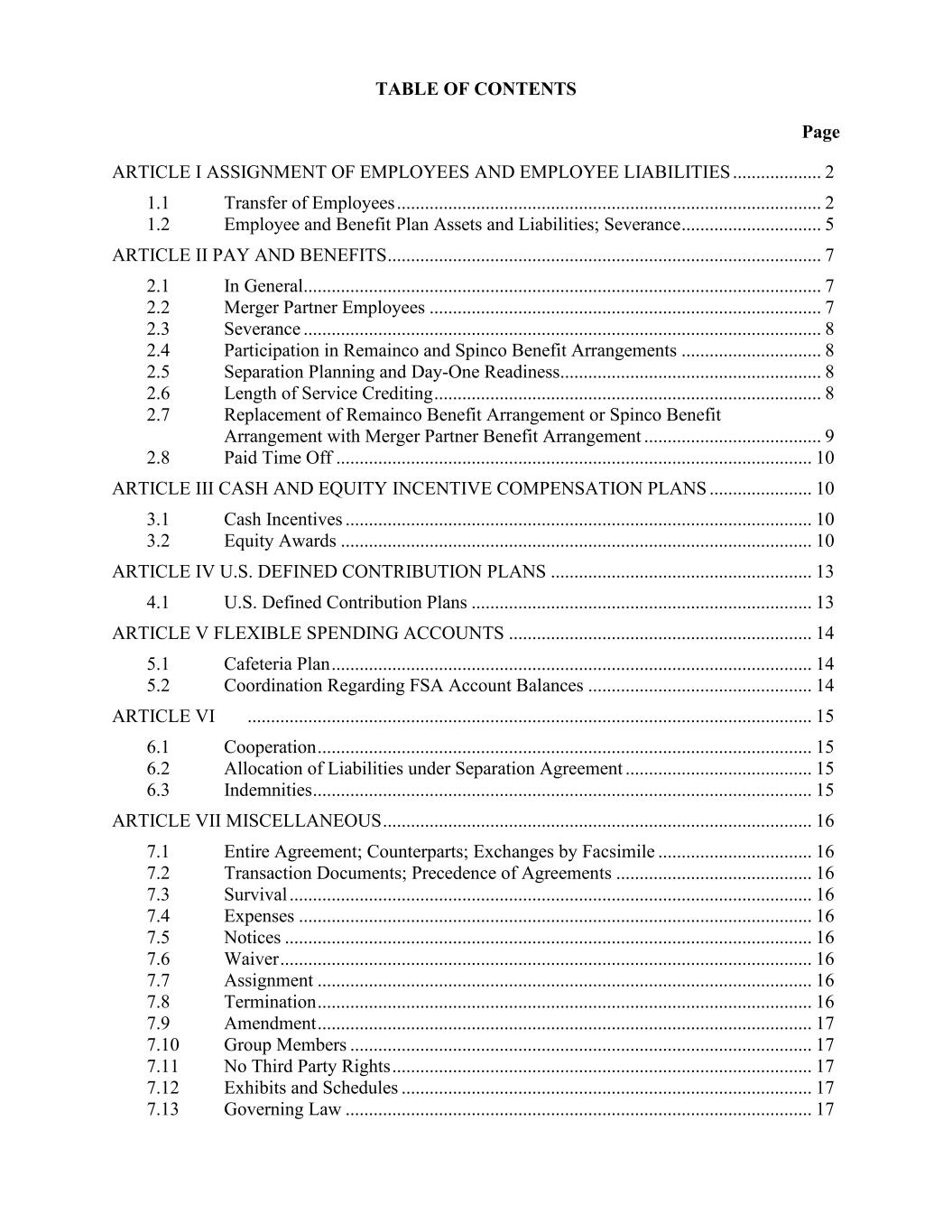 TABLE OF CONTENTS Page ARTICLE I ASSIGNMENT OF EMPLOYEES AND EMPLOYEE LIABILITIES ................... 2 1.1 Transfer of Employees ........................................................................................... 2 1.2 Employee and Benefit Plan Assets and Liabilities; Severance .............................. 5 ARTICLE II PAY AND BENEFITS ............................................................................................. 7 2.1 In General............................................................................................................... 7 2.2 Merger Partner Employees .................................................................................... 7 2.3 Severance ............................................................................................................... 8 2.4 Participation in Remainco and Spinco Benefit Arrangements .............................. 8 2.5 Separation Planning and Day-One Readiness........................................................ 8 2.6 Length of Service Crediting ................................................................................... 8 2.7 Replacement of Remainco Benefit Arrangement or Spinco Benefit Arrangement with Merger Partner Benefit Arrangement ...................................... 9 2.8 Paid Time Off ...................................................................................................... 10 ARTICLE III CASH AND EQUITY INCENTIVE COMPENSATION PLANS ...................... 10 3.1 Cash Incentives .................................................................................................... 10 3.2 Equity Awards ..................................................................................................... 10 ARTICLE IV U.S. DEFINED CONTRIBUTION PLANS ........................................................ 13 4.1 U.S. Defined Contribution Plans ......................................................................... 13 ARTICLE V FLEXIBLE SPENDING ACCOUNTS ................................................................. 14 5.1 Cafeteria Plan ....................................................................................................... 14 5.2 Coordination Regarding FSA Account Balances ................................................ 14 ARTICLE VI ......................................................................................................................... 15 6.1 Cooperation .......................................................................................................... 15 6.2 Allocation of Liabilities under Separation Agreement ........................................ 15 6.3 Indemnities ........................................................................................................... 15 ARTICLE VII MISCELLANEOUS ............................................................................................ 16 7.1 Entire Agreement; Counterparts; Exchanges by Facsimile ................................. 16 7.2 Transaction Documents; Precedence of Agreements .......................................... 16 7.3 Survival ................................................................................................................ 16 7.4 Expenses .............................................................................................................. 16 7.5 Notices ................................................................................................................. 16 7.6 Waiver .................................................................................................................. 16 7.7 Assignment .......................................................................................................... 16 7.8 Termination .......................................................................................................... 16 7.9 Amendment .......................................................................................................... 17 7.10 Group Members ................................................................................................... 17 7.11 No Third Party Rights .......................................................................................... 17 7.12 Exhibits and Schedules ........................................................................................ 17 7.13 Governing Law .................................................................................................... 17
