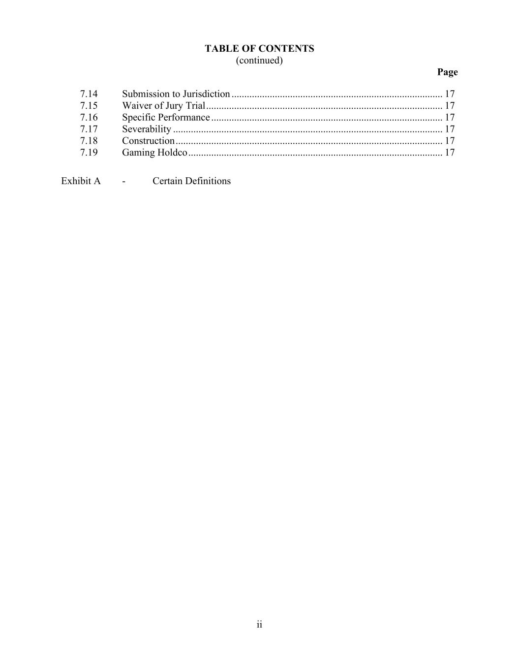 TABLE OF CONTENTS (continued) Page ii 7.14 Submission to Jurisdiction ................................................................................... 17 7.15 Waiver of Jury Trial ............................................................................................. 17 7.16 Specific Performance ........................................................................................... 17 7.17 Severability .......................................................................................................... 17 7.18 Construction ......................................................................................................... 17 7.19 Gaming Holdco .................................................................................................... 17 Exhibit A - Certain Definitions