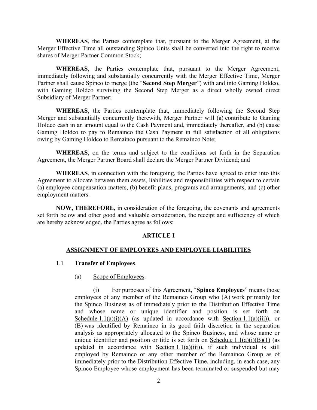 2 WHEREAS, the Parties contemplate that, pursuant to the Merger Agreement, at the Merger Effective Time all outstanding Spinco Units shall be converted into the right to receive shares of Merger Partner Common Stock; WHEREAS, the Parties contemplate that, pursuant to the Merger Agreement, immediately following and substantially concurrently with the Merger Effective Time, Merger Partner shall cause Spinco to merge (the “Second Step Merger”) with and into Gaming Holdco, with Gaming Holdco surviving the Second Step Merger as a direct wholly owned direct Subsidiary of Merger Partner; WHEREAS, the Parties contemplate that, immediately following the Second Step Merger and substantially concurrently therewith, Merger Partner will (a) contribute to Gaming Holdco cash in an amount equal to the Cash Payment and, immediately thereafter, and (b) cause Gaming Holdco to pay to Remainco the Cash Payment in full satisfaction of all obligations owing by Gaming Holdco to Remainco pursuant to the Remainco Note; WHEREAS, on the terms and subject to the conditions set forth in the Separation Agreement, the Merger Partner Board shall declare the Merger Partner Dividend; and WHEREAS, in connection with the foregoing, the Parties have agreed to enter into this Agreement to allocate between them assets, liabilities and responsibilities with respect to certain (a) employee compensation matters, (b) benefit plans, programs and arrangements, and (c) other employment matters. NOW, THEREFORE, in consideration of the foregoing, the covenants and agreements set forth below and other good and valuable consideration, the receipt and sufficiency of which are hereby acknowledged, the Parties agree as follows: ARTICLE I ASSIGNMENT OF EMPLOYEES AND EMPLOYEE LIABILITIES 1.1 Transfer of Employees. (a) Scope of Employees. (i) For purposes of this Agreement, “Spinco Employees” means those employees of any member of the Remainco Group who (A) work primarily for the Spinco Business as of immediately prior to the Distribution Effective Time and whose name or unique identifier and position is set forth on Schedule 1.1(a)(i)(A) (as updated in accordance with Section 1.1(a)(iii)), or (B) was identified by Remainco in its good faith discretion in the separation analysis as appropriately allocated to the Spinco Business, and whose name or unique identifier and position or title is set forth on Schedule 1.1(a)(i)(B)(1) (as updated in accordance with Section 1.1(a)(iii)), if such individual is still employed by Remainco or any other member of the Remainco Group as of immediately prior to the Distribution Effective Time, including, in each case, any Spinco Employee whose employment has been terminated or suspended but may