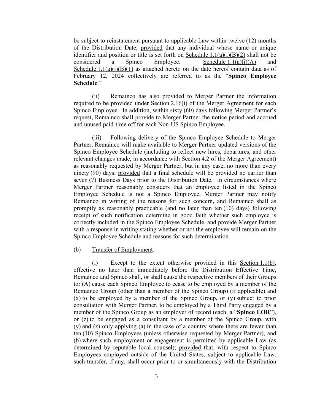 3 be subject to reinstatement pursuant to applicable Law within twelve (12) months of the Distribution Date; provided that any individual whose name or unique identifier and position or title is set forth on Schedule 1.1(a)(i)(B)(2) shall not be considered a Spinco Employee. Schedule 1.1(a)(i)(A) and Schedule 1.1(a)(i)(B)(1) as attached hereto on the date hereof contain data as of February 12, 2024 collectively are referred to as the “Spinco Employee Schedule.” (ii) Remainco has also provided to Merger Partner the information required to be provided under Section 2.16(i) of the Merger Agreement for each Spinco Employee. In addition, within sixty (60) days following Merger Partner’s request, Remainco shall provide to Merger Partner the notice period and accrued and unused paid-time off for each Non-US Spinco Employee. (iii) Following delivery of the Spinco Employee Schedule to Merger Partner, Remainco will make available to Merger Partner updated versions of the Spinco Employee Schedule (including to reflect new hires, departures, and other relevant changes made, in accordance with Section 4.2 of the Merger Agreement) as reasonably requested by Merger Partner, but in any case, no more than every ninety (90) days; provided that a final schedule will be provided no earlier than seven (7) Business Days prior to the Distribution Date. In circumstances where Merger Partner reasonably considers that an employee listed in the Spinco Employee Schedule is not a Spinco Employee, Merger Partner may notify Remainco in writing of the reasons for such concern, and Remainco shall as promptly as reasonably practicable (and no later than ten (10) days) following receipt of such notification determine in good faith whether such employee is correctly included in the Spinco Employee Schedule, and provide Merger Partner with a response in writing stating whether or not the employee will remain on the Spinco Employee Schedule and reasons for such determination. (b) Transfer of Employment. (i) Except to the extent otherwise provided in this Section 1.1(b), effective no later than immediately before the Distribution Effective Time, Remainco and Spinco shall, or shall cause the respective members of their Groups to: (A) cause each Spinco Employee to cease to be employed by a member of the Remainco Group (other than a member of the Spinco Group) (if applicable) and (x) to be employed by a member of the Spinco Group, or (y) subject to prior consultation with Merger Partner, to be employed by a Third Party engaged by a member of the Spinco Group as an employer of record (each, a “Spinco EOR”), or (z) to be engaged as a consultant by a member of the Spinco Group, with (y) and (z) only applying (a) in the case of a country where there are fewer than ten (10) Spinco Employees (unless otherwise requested by Merger Partner), and (b) where such employment or engagement is permitted by applicable Law (as determined by reputable local counsel); provided that, with respect to Spinco Employees employed outside of the United States, subject to applicable Law, such transfer, if any, shall occur prior to or simultaneously with the Distribution