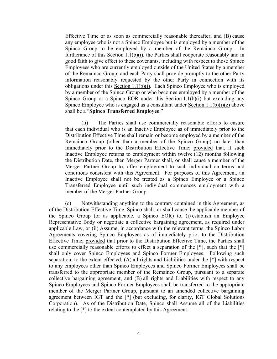 4 Effective Time or as soon as commercially reasonable thereafter; and (B) cause any employee who is not a Spinco Employee but is employed by a member of the Spinco Group to be employed by a member of the Remainco Group. In furtherance of this Section 1.1(b)(i), the Parties shall cooperate reasonably and in good faith to give effect to these covenants, including with respect to those Spinco Employees who are currently employed outside of the United States by a member of the Remainco Group, and each Party shall provide promptly to the other Party information reasonably requested by the other Party in connection with its obligations under this Section 1.1(b)(i). Each Spinco Employee who is employed by a member of the Spinco Group or who becomes employed by a member of the Spinco Group or a Spinco EOR under this Section 1.1(b)(i) but excluding any Spinco Employee who is engaged as a consultant under Section 1.1(b)(i)(z) above shall be a “Spinco Transferred Employee.” (ii) The Parties shall use commercially reasonable efforts to ensure that each individual who is an Inactive Employee as of immediately prior to the Distribution Effective Time shall remain or become employed by a member of the Remainco Group (other than a member of the Spinco Group) no later than immediately prior to the Distribution Effective Time; provided that, if such Inactive Employee returns to employment within twelve (12) months following the Distribution Date, then Merger Partner shall, or shall cause a member of the Merger Partner Group to, offer employment to such individual on terms and conditions consistent with this Agreement. For purposes of this Agreement, an Inactive Employee shall not be treated as a Spinco Employee or a Spinco Transferred Employee until such individual commences employment with a member of the Merger Partner Group. (c) Notwithstanding anything to the contrary contained in this Agreement, as of the Distribution Effective Time, Spinco shall, or shall cause the applicable member of the Spinco Group (or as applicable, a Spinco EOR) to, (i) establish an Employee Representative Body or negotiate a collective bargaining agreement, as required under applicable Law, or (ii) Assume, in accordance with the relevant terms, the Spinco Labor Agreements covering Spinco Employees as of immediately prior to the Distribution Effective Time; provided that prior to the Distribution Effective Time, the Parties shall use commercially reasonable efforts to effect a separation of the [*], such that the [*] shall only cover Spinco Employees and Spinco Former Employees. Following such separation, to the extent effected, (A) all rights and Liabilities under the [*] with respect to any employees other than Spinco Employees and Spinco Former Employees shall be transferred to the appropriate member of the Remainco Group, pursuant to a separate collective bargaining agreement, and (B) all rights and Liabilities with respect to any Spinco Employees and Spinco Former Employees shall be transferred to the appropriate member of the Merger Partner Group, pursuant to an amended collective bargaining agreement between IGT and the [*] (but excluding, for clarity, IGT Global Solutions Corporation). As of the Distribution Date, Spinco shall Assume all of the Liabilities relating to the [*] to the extent contemplated by this Agreement.