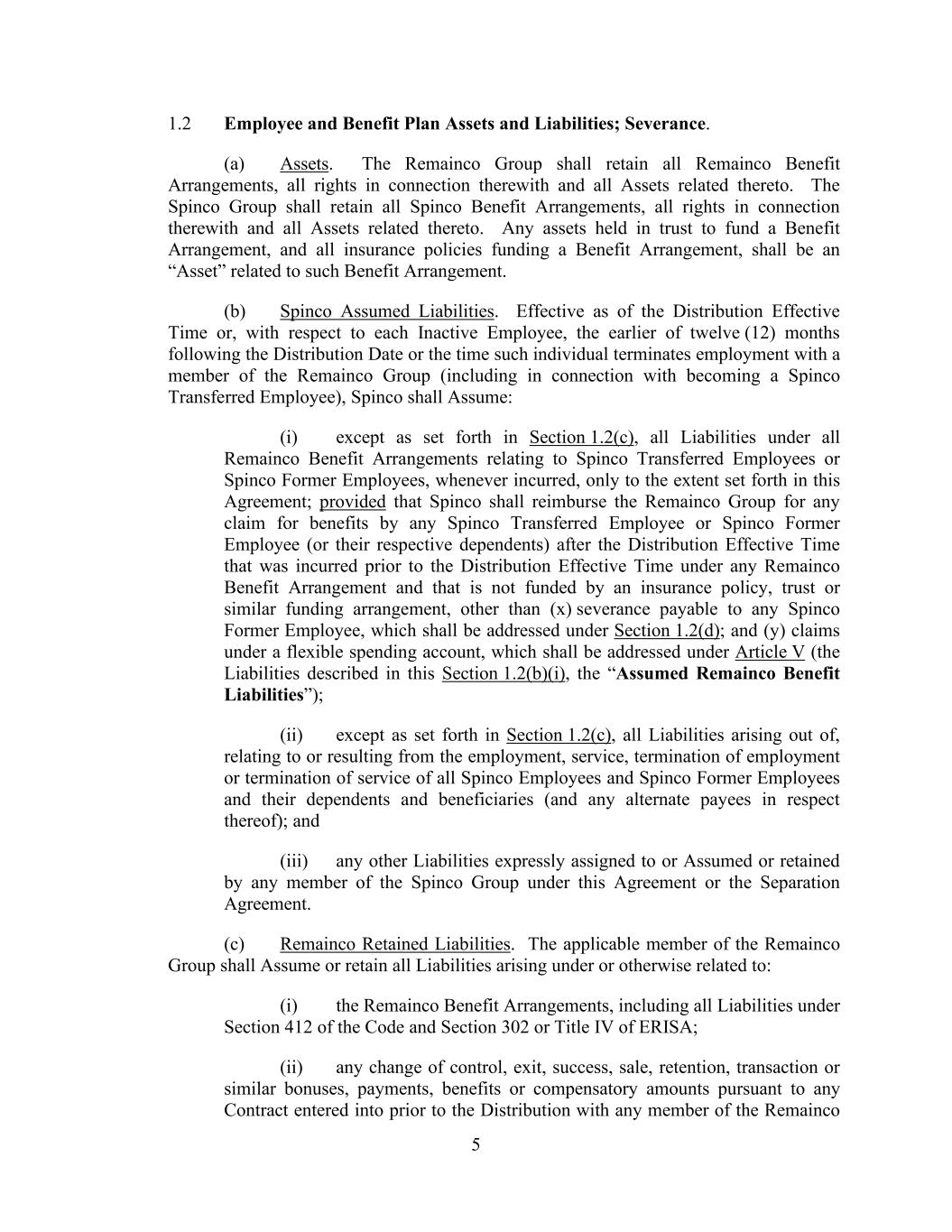 5 1.2 Employee and Benefit Plan Assets and Liabilities; Severance. (a) Assets. The Remainco Group shall retain all Remainco Benefit Arrangements, all rights in connection therewith and all Assets related thereto. The Spinco Group shall retain all Spinco Benefit Arrangements, all rights in connection therewith and all Assets related thereto. Any assets held in trust to fund a Benefit Arrangement, and all insurance policies funding a Benefit Arrangement, shall be an “Asset” related to such Benefit Arrangement. (b) Spinco Assumed Liabilities. Effective as of the Distribution Effective Time or, with respect to each Inactive Employee, the earlier of twelve (12) months following the Distribution Date or the time such individual terminates employment with a member of the Remainco Group (including in connection with becoming a Spinco Transferred Employee), Spinco shall Assume: (i) except as set forth in Section 1.2(c), all Liabilities under all Remainco Benefit Arrangements relating to Spinco Transferred Employees or Spinco Former Employees, whenever incurred, only to the extent set forth in this Agreement; provided that Spinco shall reimburse the Remainco Group for any claim for benefits by any Spinco Transferred Employee or Spinco Former Employee (or their respective dependents) after the Distribution Effective Time that was incurred prior to the Distribution Effective Time under any Remainco Benefit Arrangement and that is not funded by an insurance policy, trust or similar funding arrangement, other than (x) severance payable to any Spinco Former Employee, which shall be addressed under Section 1.2(d); and (y) claims under a flexible spending account, which shall be addressed under Article V (the Liabilities described in this Section 1.2(b)(i), the “Assumed Remainco Benefit Liabilities”); (ii) except as set forth in Section 1.2(c), all Liabilities arising out of, relating to or resulting from the employment, service, termination of employment or termination of service of all Spinco Employees and Spinco Former Employees and their dependents and beneficiaries (and any alternate payees in respect thereof); and (iii) any other Liabilities expressly assigned to or Assumed or retained by any member of the Spinco Group under this Agreement or the Separation Agreement. (c) Remainco Retained Liabilities. The applicable member of the Remainco Group shall Assume or retain all Liabilities arising under or otherwise related to: (i) the Remainco Benefit Arrangements, including all Liabilities under Section 412 of the Code and Section 302 or Title IV of ERISA; (ii) any change of control, exit, success, sale, retention, transaction or similar bonuses, payments, benefits or compensatory amounts pursuant to any Contract entered into prior to the Distribution with any member of the Remainco