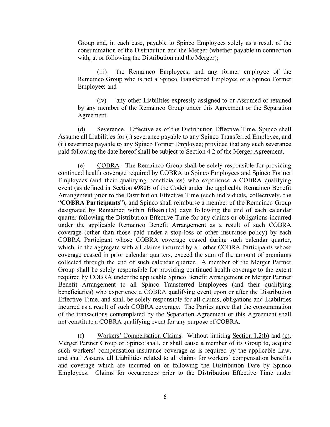 6 Group and, in each case, payable to Spinco Employees solely as a result of the consummation of the Distribution and the Merger (whether payable in connection with, at or following the Distribution and the Merger); (iii) the Remainco Employees, and any former employee of the Remainco Group who is not a Spinco Transferred Employee or a Spinco Former Employee; and (iv) any other Liabilities expressly assigned to or Assumed or retained by any member of the Remainco Group under this Agreement or the Separation Agreement. (d) Severance. Effective as of the Distribution Effective Time, Spinco shall Assume all Liabilities for (i) severance payable to any Spinco Transferred Employee, and (ii) severance payable to any Spinco Former Employee; provided that any such severance paid following the date hereof shall be subject to Section 4.2 of the Merger Agreement. (e) COBRA. The Remainco Group shall be solely responsible for providing continued health coverage required by COBRA to Spinco Employees and Spinco Former Employees (and their qualifying beneficiaries) who experience a COBRA qualifying event (as defined in Section 4980B of the Code) under the applicable Remainco Benefit Arrangement prior to the Distribution Effective Time (such individuals, collectively, the “COBRA Participants”), and Spinco shall reimburse a member of the Remainco Group designated by Remainco within fifteen (15) days following the end of each calendar quarter following the Distribution Effective Time for any claims or obligations incurred under the applicable Remainco Benefit Arrangement as a result of such COBRA coverage (other than those paid under a stop-loss or other insurance policy) by each COBRA Participant whose COBRA coverage ceased during such calendar quarter, which, in the aggregate with all claims incurred by all other COBRA Participants whose coverage ceased in prior calendar quarters, exceed the sum of the amount of premiums collected through the end of such calendar quarter. A member of the Merger Partner Group shall be solely responsible for providing continued health coverage to the extent required by COBRA under the applicable Spinco Benefit Arrangement or Merger Partner Benefit Arrangement to all Spinco Transferred Employees (and their qualifying beneficiaries) who experience a COBRA qualifying event upon or after the Distribution Effective Time, and shall be solely responsible for all claims, obligations and Liabilities incurred as a result of such COBRA coverage. The Parties agree that the consummation of the transactions contemplated by the Separation Agreement or this Agreement shall not constitute a COBRA qualifying event for any purpose of COBRA. (f) Workers’ Compensation Claims. Without limiting Section 1.2(b) and (c), Merger Partner Group or Spinco shall, or shall cause a member of its Group to, acquire such workers’ compensation insurance coverage as is required by the applicable Law, and shall Assume all Liabilities related to all claims for workers’ compensation benefits and coverage which are incurred on or following the Distribution Date by Spinco Employees. Claims for occurrences prior to the Distribution Effective Time under
