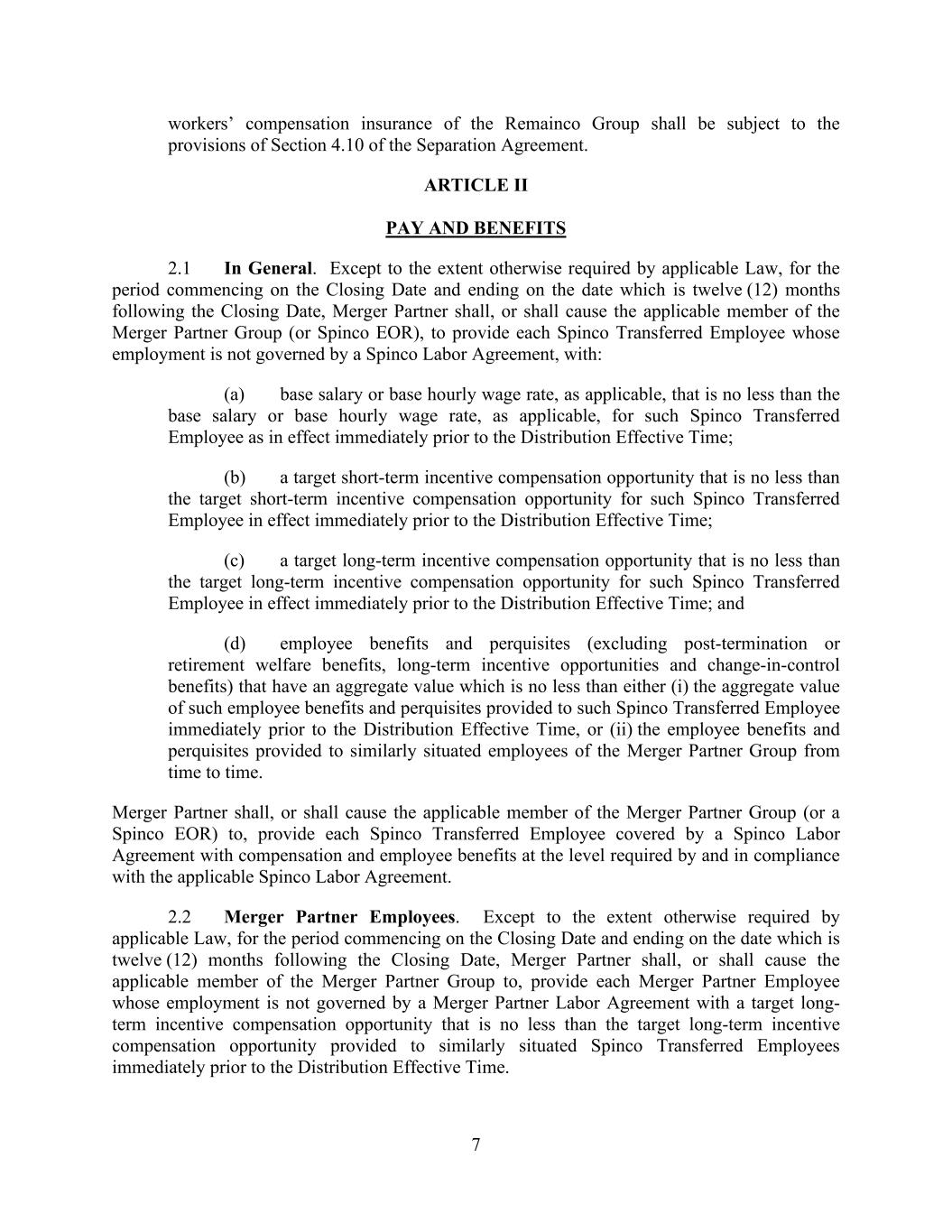 7 workers’ compensation insurance of the Remainco Group shall be subject to the provisions of Section 4.10 of the Separation Agreement. ARTICLE II PAY AND BENEFITS 2.1 In General. Except to the extent otherwise required by applicable Law, for the period commencing on the Closing Date and ending on the date which is twelve (12) months following the Closing Date, Merger Partner shall, or shall cause the applicable member of the Merger Partner Group (or Spinco EOR), to provide each Spinco Transferred Employee whose employment is not governed by a Spinco Labor Agreement, with: (a) base salary or base hourly wage rate, as applicable, that is no less than the base salary or base hourly wage rate, as applicable, for such Spinco Transferred Employee as in effect immediately prior to the Distribution Effective Time; (b) a target short-term incentive compensation opportunity that is no less than the target short-term incentive compensation opportunity for such Spinco Transferred Employee in effect immediately prior to the Distribution Effective Time; (c) a target long-term incentive compensation opportunity that is no less than the target long-term incentive compensation opportunity for such Spinco Transferred Employee in effect immediately prior to the Distribution Effective Time; and (d) employee benefits and perquisites (excluding post-termination or retirement welfare benefits, long-term incentive opportunities and change-in-control benefits) that have an aggregate value which is no less than either (i) the aggregate value of such employee benefits and perquisites provided to such Spinco Transferred Employee immediately prior to the Distribution Effective Time, or (ii) the employee benefits and perquisites provided to similarly situated employees of the Merger Partner Group from time to time. Merger Partner shall, or shall cause the applicable member of the Merger Partner Group (or a Spinco EOR) to, provide each Spinco Transferred Employee covered by a Spinco Labor Agreement with compensation and employee benefits at the level required by and in compliance with the applicable Spinco Labor Agreement. 2.2 Merger Partner Employees. Except to the extent otherwise required by applicable Law, for the period commencing on the Closing Date and ending on the date which is twelve (12) months following the Closing Date, Merger Partner shall, or shall cause the applicable member of the Merger Partner Group to, provide each Merger Partner Employee whose employment is not governed by a Merger Partner Labor Agreement with a target long- term incentive compensation opportunity that is no less than the target long-term incentive compensation opportunity provided to similarly situated Spinco Transferred Employees immediately prior to the Distribution Effective Time.
