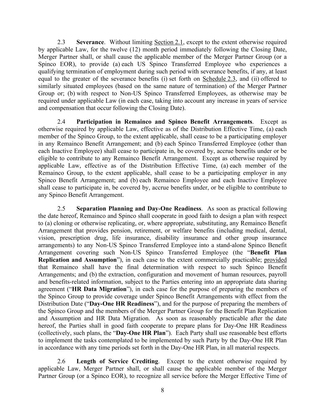 8 2.3 Severance. Without limiting Section 2.1, except to the extent otherwise required by applicable Law, for the twelve (12) month period immediately following the Closing Date, Merger Partner shall, or shall cause the applicable member of the Merger Partner Group (or a Spinco EOR), to provide (a) each US Spinco Transferred Employee who experiences a qualifying termination of employment during such period with severance benefits, if any, at least equal to the greater of the severance benefits (i) set forth on Schedule 2.3, and (ii) offered to similarly situated employees (based on the same nature of termination) of the Merger Partner Group or; (b) with respect to Non-US Spinco Transferred Employees, as otherwise may be required under applicable Law (in each case, taking into account any increase in years of service and compensation that occur following the Closing Date). 2.4 Participation in Remainco and Spinco Benefit Arrangements. Except as otherwise required by applicable Law, effective as of the Distribution Effective Time, (a) each member of the Spinco Group, to the extent applicable, shall cease to be a participating employer in any Remainco Benefit Arrangement; and (b) each Spinco Transferred Employee (other than each Inactive Employee) shall cease to participate in, be covered by, accrue benefits under or be eligible to contribute to any Remainco Benefit Arrangement. Except as otherwise required by applicable Law, effective as of the Distribution Effective Time, (a) each member of the Remainco Group, to the extent applicable, shall cease to be a participating employer in any Spinco Benefit Arrangement; and (b) each Remainco Employee and each Inactive Employee shall cease to participate in, be covered by, accrue benefits under, or be eligible to contribute to any Spinco Benefit Arrangement. 2.5 Separation Planning and Day-One Readiness. As soon as practical following the date hereof, Remainco and Spinco shall cooperate in good faith to design a plan with respect to (a) cloning or otherwise replicating, or, where appropriate, substituting, any Remainco Benefit Arrangement that provides pension, retirement, or welfare benefits (including medical, dental, vision, prescription drug, life insurance, disability insurance and other group insurance arrangements) to any Non-US Spinco Transferred Employee into a stand-alone Spinco Benefit Arrangement covering such Non-US Spinco Transferred Employee (the “Benefit Plan Replication and Assumption”), in each case to the extent commercially practicable; provided that Remainco shall have the final determination with respect to such Spinco Benefit Arrangements; and (b) the extraction, configuration and movement of human resources, payroll and benefits-related information, subject to the Parties entering into an appropriate data sharing agreement (“HR Data Migration”), in each case for the purpose of preparing the members of the Spinco Group to provide coverage under Spinco Benefit Arrangements with effect from the Distribution Date (“Day-One HR Readiness”), and for the purpose of preparing the members of the Spinco Group and the members of the Merger Partner Group for the Benefit Plan Replication and Assumption and HR Data Migration. As soon as reasonably practicable after the date hereof, the Parties shall in good faith cooperate to prepare plans for Day-One HR Readiness (collectively, such plans, the “Day-One HR Plan”). Each Party shall use reasonable best efforts to implement the tasks contemplated to be implemented by such Party by the Day-One HR Plan in accordance with any time periods set forth in the Day-One HR Plan, in all material respects. 2.6 Length of Service Crediting. Except to the extent otherwise required by applicable Law, Merger Partner shall, or shall cause the applicable member of the Merger Partner Group (or a Spinco EOR), to recognize all service before the Merger Effective Time of