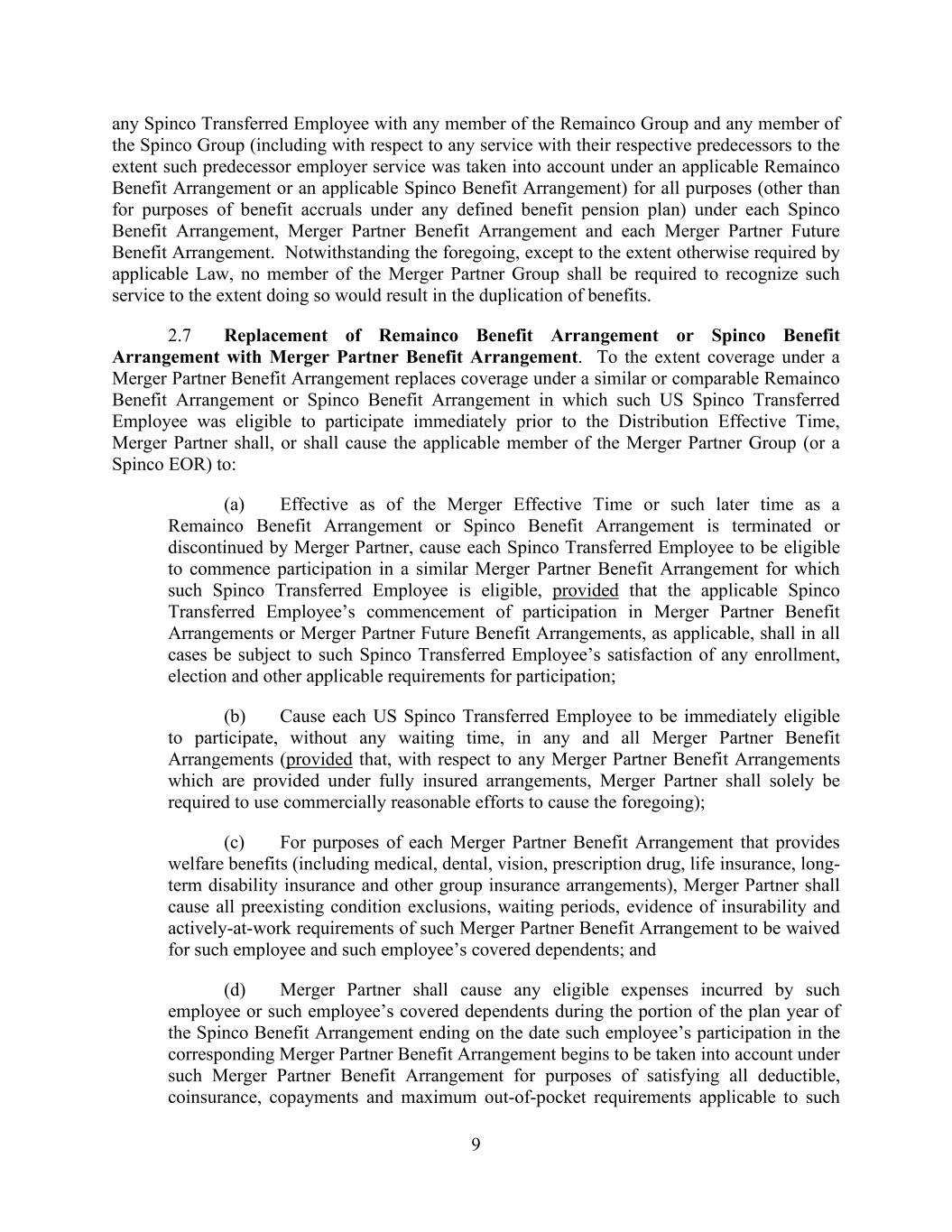 9 any Spinco Transferred Employee with any member of the Remainco Group and any member of the Spinco Group (including with respect to any service with their respective predecessors to the extent such predecessor employer service was taken into account under an applicable Remainco Benefit Arrangement or an applicable Spinco Benefit Arrangement) for all purposes (other than for purposes of benefit accruals under any defined benefit pension plan) under each Spinco Benefit Arrangement, Merger Partner Benefit Arrangement and each Merger Partner Future Benefit Arrangement. Notwithstanding the foregoing, except to the extent otherwise required by applicable Law, no member of the Merger Partner Group shall be required to recognize such service to the extent doing so would result in the duplication of benefits. 2.7 Replacement of Remainco Benefit Arrangement or Spinco Benefit Arrangement with Merger Partner Benefit Arrangement. To the extent coverage under a Merger Partner Benefit Arrangement replaces coverage under a similar or comparable Remainco Benefit Arrangement or Spinco Benefit Arrangement in which such US Spinco Transferred Employee was eligible to participate immediately prior to the Distribution Effective Time, Merger Partner shall, or shall cause the applicable member of the Merger Partner Group (or a Spinco EOR) to: (a) Effective as of the Merger Effective Time or such later time as a Remainco Benefit Arrangement or Spinco Benefit Arrangement is terminated or discontinued by Merger Partner, cause each Spinco Transferred Employee to be eligible to commence participation in a similar Merger Partner Benefit Arrangement for which such Spinco Transferred Employee is eligible, provided that the applicable Spinco Transferred Employee’s commencement of participation in Merger Partner Benefit Arrangements or Merger Partner Future Benefit Arrangements, as applicable, shall in all cases be subject to such Spinco Transferred Employee’s satisfaction of any enrollment, election and other applicable requirements for participation; (b) Cause each US Spinco Transferred Employee to be immediately eligible to participate, without any waiting time, in any and all Merger Partner Benefit Arrangements (provided that, with respect to any Merger Partner Benefit Arrangements which are provided under fully insured arrangements, Merger Partner shall solely be required to use commercially reasonable efforts to cause the foregoing); (c) For purposes of each Merger Partner Benefit Arrangement that provides welfare benefits (including medical, dental, vision, prescription drug, life insurance, long- term disability insurance and other group insurance arrangements), Merger Partner shall cause all preexisting condition exclusions, waiting periods, evidence of insurability and actively-at-work requirements of such Merger Partner Benefit Arrangement to be waived for such employee and such employee’s covered dependents; and (d) Merger Partner shall cause any eligible expenses incurred by such employee or such employee’s covered dependents during the portion of the plan year of the Spinco Benefit Arrangement ending on the date such employee’s participation in the corresponding Merger Partner Benefit Arrangement begins to be taken into account under such Merger Partner Benefit Arrangement for purposes of satisfying all deductible, coinsurance, copayments and maximum out-of-pocket requirements applicable to such