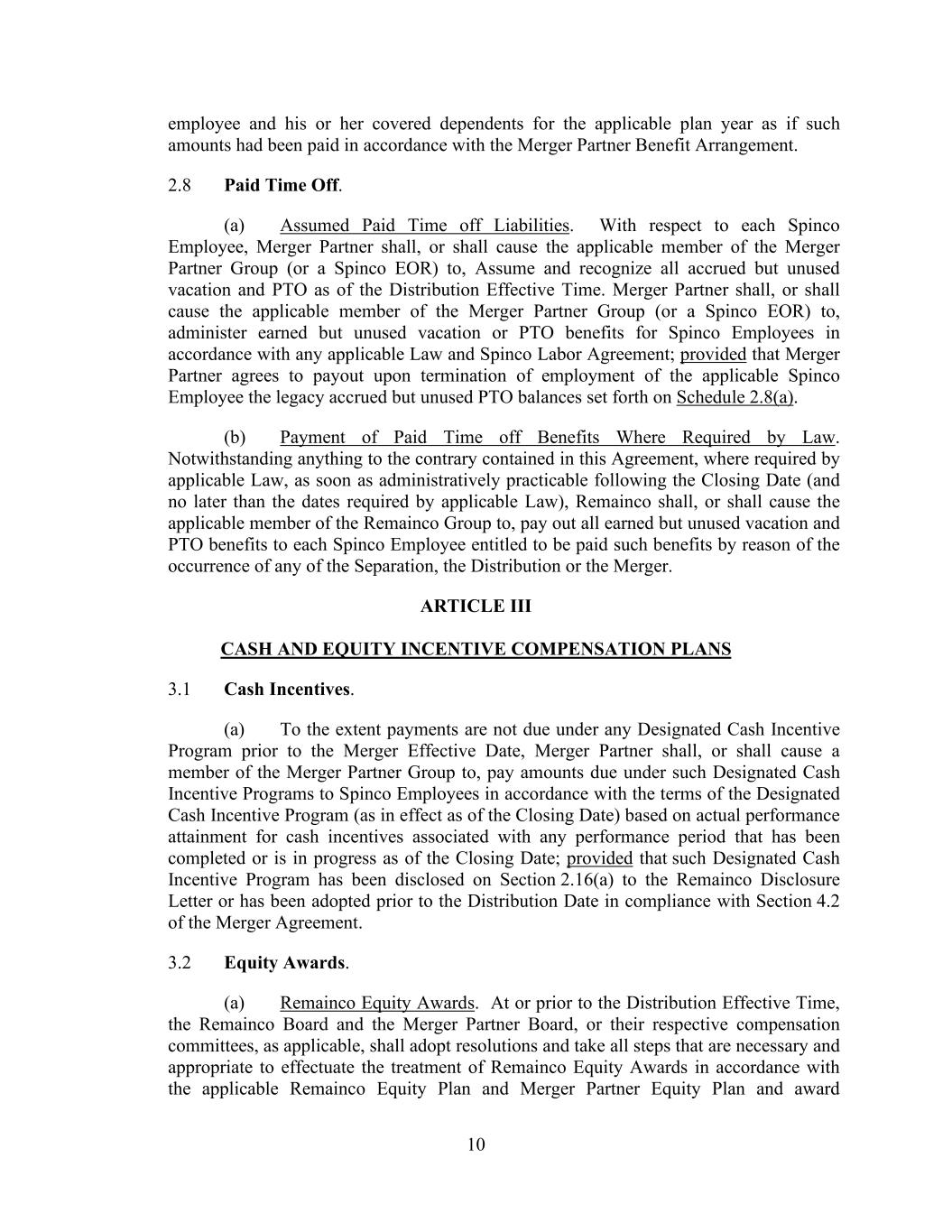 10 employee and his or her covered dependents for the applicable plan year as if such amounts had been paid in accordance with the Merger Partner Benefit Arrangement. 2.8 Paid Time Off. (a) Assumed Paid Time off Liabilities. With respect to each Spinco Employee, Merger Partner shall, or shall cause the applicable member of the Merger Partner Group (or a Spinco EOR) to, Assume and recognize all accrued but unused vacation and PTO as of the Distribution Effective Time. Merger Partner shall, or shall cause the applicable member of the Merger Partner Group (or a Spinco EOR) to, administer earned but unused vacation or PTO benefits for Spinco Employees in accordance with any applicable Law and Spinco Labor Agreement; provided that Merger Partner agrees to payout upon termination of employment of the applicable Spinco Employee the legacy accrued but unused PTO balances set forth on Schedule 2.8(a). (b) Payment of Paid Time off Benefits Where Required by Law. Notwithstanding anything to the contrary contained in this Agreement, where required by applicable Law, as soon as administratively practicable following the Closing Date (and no later than the dates required by applicable Law), Remainco shall, or shall cause the applicable member of the Remainco Group to, pay out all earned but unused vacation and PTO benefits to each Spinco Employee entitled to be paid such benefits by reason of the occurrence of any of the Separation, the Distribution or the Merger. ARTICLE III CASH AND EQUITY INCENTIVE COMPENSATION PLANS 3.1 Cash Incentives. (a) To the extent payments are not due under any Designated Cash Incentive Program prior to the Merger Effective Date, Merger Partner shall, or shall cause a member of the Merger Partner Group to, pay amounts due under such Designated Cash Incentive Programs to Spinco Employees in accordance with the terms of the Designated Cash Incentive Program (as in effect as of the Closing Date) based on actual performance attainment for cash incentives associated with any performance period that has been completed or is in progress as of the Closing Date; provided that such Designated Cash Incentive Program has been disclosed on Section 2.16(a) to the Remainco Disclosure Letter or has been adopted prior to the Distribution Date in compliance with Section 4.2 of the Merger Agreement. 3.2 Equity Awards. (a) Remainco Equity Awards. At or prior to the Distribution Effective Time, the Remainco Board and the Merger Partner Board, or their respective compensation committees, as applicable, shall adopt resolutions and take all steps that are necessary and appropriate to effectuate the treatment of Remainco Equity Awards in accordance with the applicable Remainco Equity Plan and Merger Partner Equity Plan and award