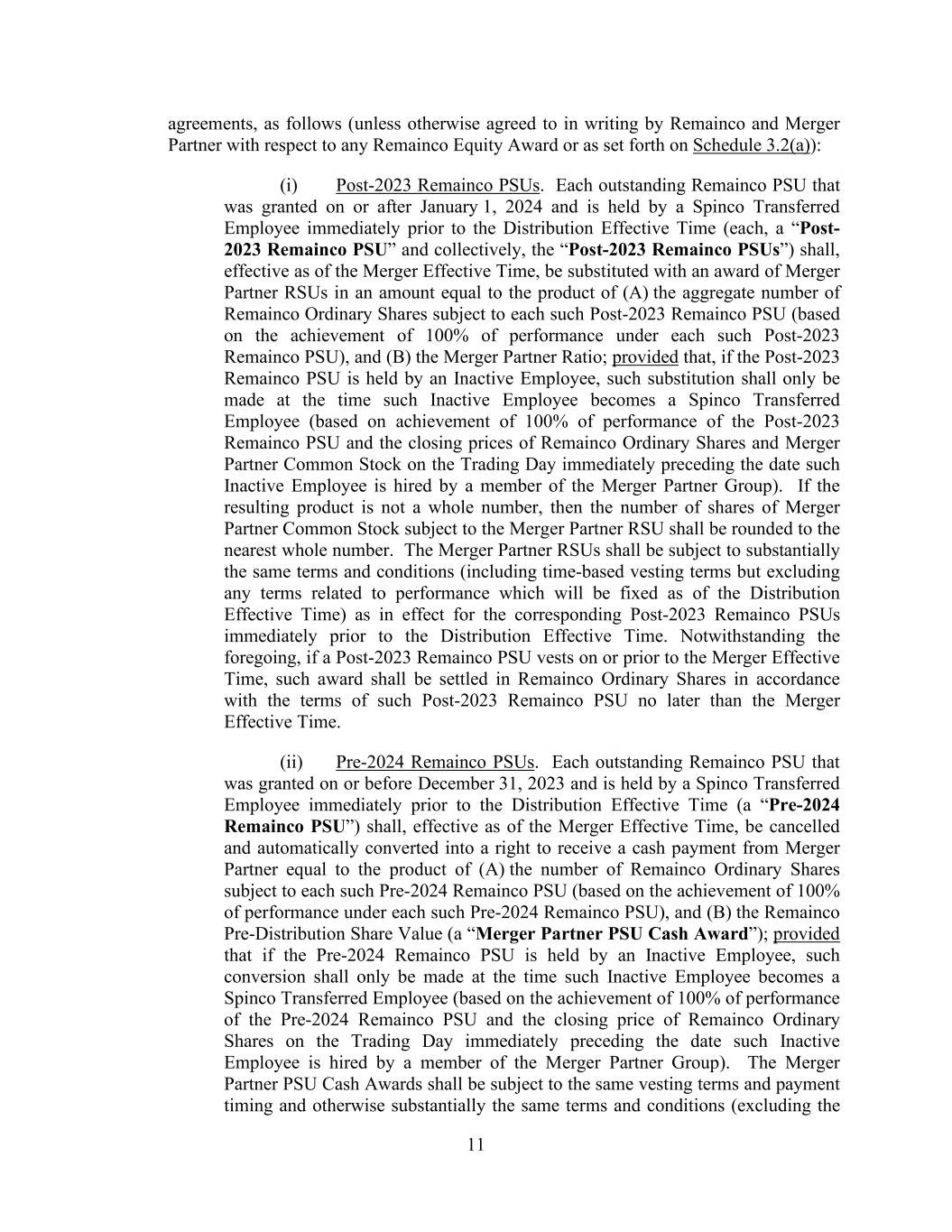 11 agreements, as follows (unless otherwise agreed to in writing by Remainco and Merger Partner with respect to any Remainco Equity Award or as set forth on Schedule 3.2(a)): (i) Post-2023 Remainco PSUs. Each outstanding Remainco PSU that was granted on or after January 1, 2024 and is held by a Spinco Transferred Employee immediately prior to the Distribution Effective Time (each, a “Post- 2023 Remainco PSU” and collectively, the “Post-2023 Remainco PSUs”) shall, effective as of the Merger Effective Time, be substituted with an award of Merger Partner RSUs in an amount equal to the product of (A) the aggregate number of Remainco Ordinary Shares subject to each such Post-2023 Remainco PSU (based on the achievement of 100% of performance under each such Post-2023 Remainco PSU), and (B) the Merger Partner Ratio; provided that, if the Post-2023 Remainco PSU is held by an Inactive Employee, such substitution shall only be made at the time such Inactive Employee becomes a Spinco Transferred Employee (based on achievement of 100% of performance of the Post-2023 Remainco PSU and the closing prices of Remainco Ordinary Shares and Merger Partner Common Stock on the Trading Day immediately preceding the date such Inactive Employee is hired by a member of the Merger Partner Group). If the resulting product is not a whole number, then the number of shares of Merger Partner Common Stock subject to the Merger Partner RSU shall be rounded to the nearest whole number. The Merger Partner RSUs shall be subject to substantially the same terms and conditions (including time-based vesting terms but excluding any terms related to performance which will be fixed as of the Distribution Effective Time) as in effect for the corresponding Post-2023 Remainco PSUs immediately prior to the Distribution Effective Time. Notwithstanding the foregoing, if a Post-2023 Remainco PSU vests on or prior to the Merger Effective Time, such award shall be settled in Remainco Ordinary Shares in accordance with the terms of such Post-2023 Remainco PSU no later than the Merger Effective Time. (ii) Pre-2024 Remainco PSUs. Each outstanding Remainco PSU that was granted on or before December 31, 2023 and is held by a Spinco Transferred Employee immediately prior to the Distribution Effective Time (a “Pre-2024 Remainco PSU”) shall, effective as of the Merger Effective Time, be cancelled and automatically converted into a right to receive a cash payment from Merger Partner equal to the product of (A) the number of Remainco Ordinary Shares subject to each such Pre-2024 Remainco PSU (based on the achievement of 100% of performance under each such Pre-2024 Remainco PSU), and (B) the Remainco Pre-Distribution Share Value (a “Merger Partner PSU Cash Award”); provided that if the Pre-2024 Remainco PSU is held by an Inactive Employee, such conversion shall only be made at the time such Inactive Employee becomes a Spinco Transferred Employee (based on the achievement of 100% of performance of the Pre-2024 Remainco PSU and the closing price of Remainco Ordinary Shares on the Trading Day immediately preceding the date such Inactive Employee is hired by a member of the Merger Partner Group). The Merger Partner PSU Cash Awards shall be subject to the same vesting terms and payment timing and otherwise substantially the same terms and conditions (excluding the