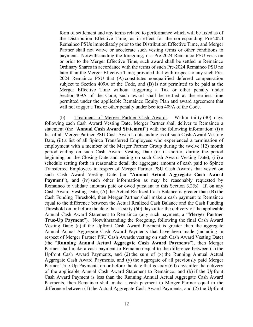 12 form of settlement and any terms related to performance which will be fixed as of the Distribution Effective Time) as in effect for the corresponding Pre-2024 Remainco PSUs immediately prior to the Distribution Effective Time, and Merger Partner shall not waive or accelerate such vesting terms or other conditions to payment. Notwithstanding the foregoing, if a Pre-2024 Remainco PSU vests on or prior to the Merger Effective Time, such award shall be settled in Remainco Ordinary Shares in accordance with the terms of such Pre-2024 Remainco PSU no later than the Merger Effective Time; provided that with respect to any such Pre- 2024 Remainco PSU that (A) constitutes nonqualified deferred compensation subject to Section 409A of the Code, and (B) is not permitted to be paid at the Merger Effective Time without triggering a Tax or other penalty under Section 409A of the Code, such award shall be settled at the earliest time permitted under the applicable Remainco Equity Plan and award agreement that will not trigger a Tax or other penalty under Section 409A of the Code. (b) Treatment of Merger Partner Cash Awards. Within thirty (30) days following each Cash Award Vesting Date, Merger Partner shall deliver to Remainco a statement (the “Annual Cash Award Statement”) with the following information: (i) a list of all Merger Partner PSU Cash Awards outstanding as of such Cash Award Vesting Date, (ii) a list of all Spinco Transferred Employees who experienced a termination of employment with a member of the Merger Partner Group during the twelve (12) month period ending on such Cash Award Vesting Date (or if shorter, during the period beginning on the Closing Date and ending on such Cash Award Vesting Date), (iii) a schedule setting forth in reasonable detail the aggregate amount of cash paid to Spinco Transferred Employees in respect of Merger Partner PSU Cash Awards that vested on such Cash Award Vesting Date (an “Annual Actual Aggregate Cash Award Payment”), and (iv) such other information as may be reasonably requested by Remainco to validate amounts paid or owed pursuant to this Section 3.2(b). If, on any Cash Award Vesting Date, (A) the Actual Realized Cash Balance is greater than (B) the Cash Funding Threshold, then Merger Partner shall make a cash payment to Remainco equal to the difference between the Actual Realized Cash Balance and the Cash Funding Threshold on or before the date that is sixty (60) days after the delivery of the applicable Annual Cash Award Statement to Remainco (any such payment, a “Merger Partner True-Up Payment”). Notwithstanding the foregoing, following the final Cash Award Vesting Date: (a) if the Upfront Cash Award Payment is greater than the aggregate Annual Actual Aggregate Cash Award Payments that have been made (including in respect of Merger Partner PSU Cash Awards vesting on such Cash Award Vesting Date) (the “Running Annual Actual Aggregate Cash Award Payments”), then Merger Partner shall make a cash payment to Remainco equal to the difference between (1) the Upfront Cash Award Payments, and (2) the sum of (x) the Running Annual Actual Aggregate Cash Award Payments, and (y) the aggregate of all previously paid Merger Partner True-Up Payments on or before the date that is sixty (60) days after the delivery of the applicable Annual Cash Award Statement to Remainco; and (b) if the Upfront Cash Award Payment is less than the Running Annual Actual Aggregate Cash Award Payments, then Remainco shall make a cash payment to Merger Partner equal to the difference between (1) the Actual Aggregate Cash Award Payments, and (2) the Upfront