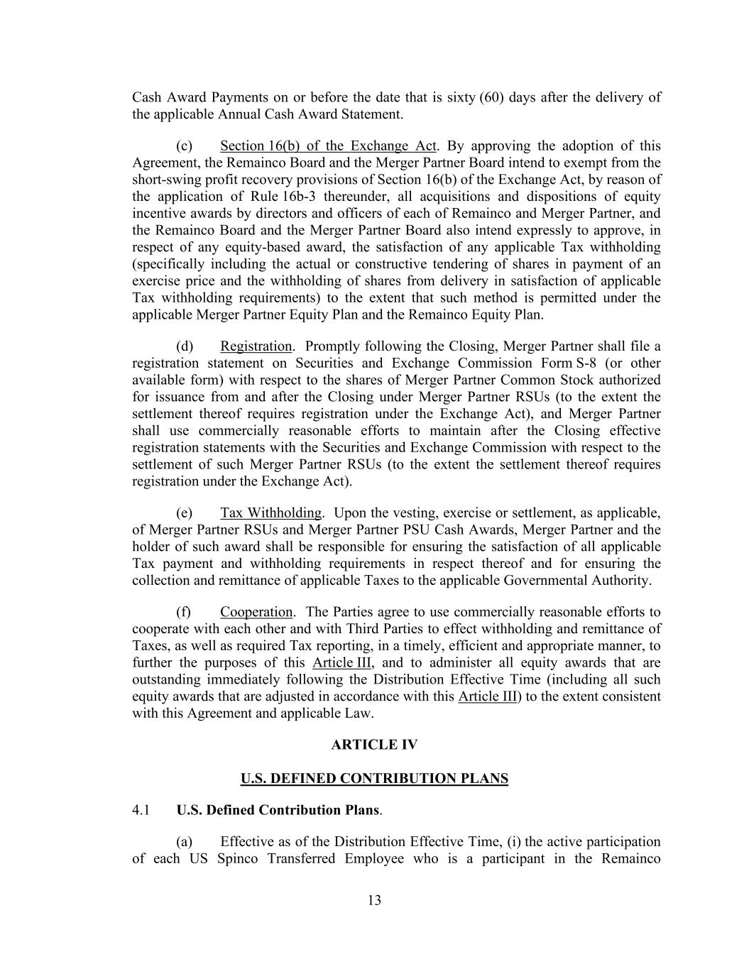 13 Cash Award Payments on or before the date that is sixty (60) days after the delivery of the applicable Annual Cash Award Statement. (c) Section 16(b) of the Exchange Act. By approving the adoption of this Agreement, the Remainco Board and the Merger Partner Board intend to exempt from the short-swing profit recovery provisions of Section 16(b) of the Exchange Act, by reason of the application of Rule 16b-3 thereunder, all acquisitions and dispositions of equity incentive awards by directors and officers of each of Remainco and Merger Partner, and the Remainco Board and the Merger Partner Board also intend expressly to approve, in respect of any equity-based award, the satisfaction of any applicable Tax withholding (specifically including the actual or constructive tendering of shares in payment of an exercise price and the withholding of shares from delivery in satisfaction of applicable Tax withholding requirements) to the extent that such method is permitted under the applicable Merger Partner Equity Plan and the Remainco Equity Plan. (d) Registration. Promptly following the Closing, Merger Partner shall file a registration statement on Securities and Exchange Commission Form S-8 (or other available form) with respect to the shares of Merger Partner Common Stock authorized for issuance from and after the Closing under Merger Partner RSUs (to the extent the settlement thereof requires registration under the Exchange Act), and Merger Partner shall use commercially reasonable efforts to maintain after the Closing effective registration statements with the Securities and Exchange Commission with respect to the settlement of such Merger Partner RSUs (to the extent the settlement thereof requires registration under the Exchange Act). (e) Tax Withholding. Upon the vesting, exercise or settlement, as applicable, of Merger Partner RSUs and Merger Partner PSU Cash Awards, Merger Partner and the holder of such award shall be responsible for ensuring the satisfaction of all applicable Tax payment and withholding requirements in respect thereof and for ensuring the collection and remittance of applicable Taxes to the applicable Governmental Authority. (f) Cooperation. The Parties agree to use commercially reasonable efforts to cooperate with each other and with Third Parties to effect withholding and remittance of Taxes, as well as required Tax reporting, in a timely, efficient and appropriate manner, to further the purposes of this Article III, and to administer all equity awards that are outstanding immediately following the Distribution Effective Time (including all such equity awards that are adjusted in accordance with this Article III) to the extent consistent with this Agreement and applicable Law. ARTICLE IV U.S. DEFINED CONTRIBUTION PLANS 4.1 U.S. Defined Contribution Plans. (a) Effective as of the Distribution Effective Time, (i) the active participation of each US Spinco Transferred Employee who is a participant in the Remainco