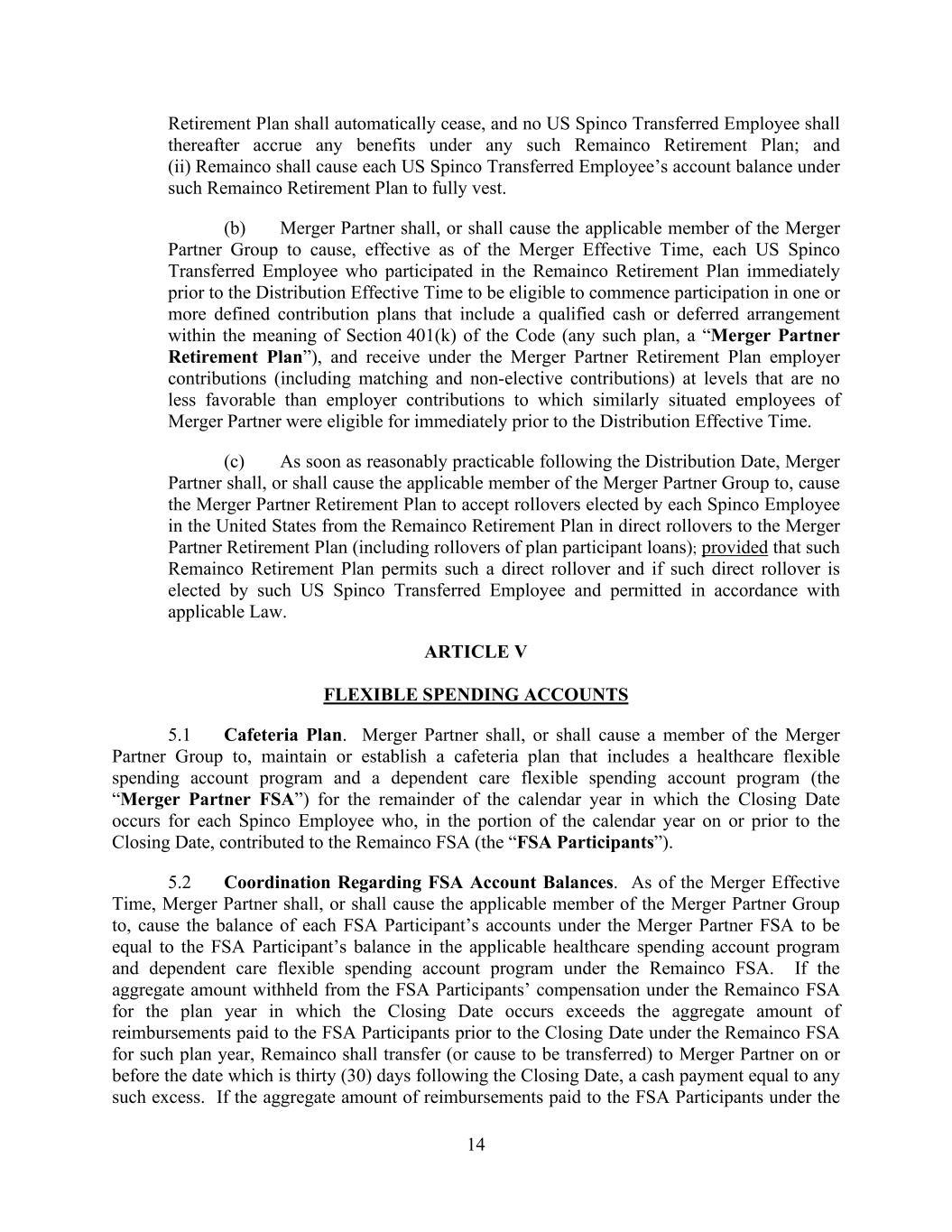 14 Retirement Plan shall automatically cease, and no US Spinco Transferred Employee shall thereafter accrue any benefits under any such Remainco Retirement Plan; and (ii) Remainco shall cause each US Spinco Transferred Employee’s account balance under such Remainco Retirement Plan to fully vest. (b) Merger Partner shall, or shall cause the applicable member of the Merger Partner Group to cause, effective as of the Merger Effective Time, each US Spinco Transferred Employee who participated in the Remainco Retirement Plan immediately prior to the Distribution Effective Time to be eligible to commence participation in one or more defined contribution plans that include a qualified cash or deferred arrangement within the meaning of Section 401(k) of the Code (any such plan, a “Merger Partner Retirement Plan”), and receive under the Merger Partner Retirement Plan employer contributions (including matching and non-elective contributions) at levels that are no less favorable than employer contributions to which similarly situated employees of Merger Partner were eligible for immediately prior to the Distribution Effective Time. (c) As soon as reasonably practicable following the Distribution Date, Merger Partner shall, or shall cause the applicable member of the Merger Partner Group to, cause the Merger Partner Retirement Plan to accept rollovers elected by each Spinco Employee in the United States from the Remainco Retirement Plan in direct rollovers to the Merger Partner Retirement Plan (including rollovers of plan participant loans); provided that such Remainco Retirement Plan permits such a direct rollover and if such direct rollover is elected by such US Spinco Transferred Employee and permitted in accordance with applicable Law. ARTICLE V FLEXIBLE SPENDING ACCOUNTS 5.1 Cafeteria Plan. Merger Partner shall, or shall cause a member of the Merger Partner Group to, maintain or establish a cafeteria plan that includes a healthcare flexible spending account program and a dependent care flexible spending account program (the “Merger Partner FSA”) for the remainder of the calendar year in which the Closing Date occurs for each Spinco Employee who, in the portion of the calendar year on or prior to the Closing Date, contributed to the Remainco FSA (the “FSA Participants”). 5.2 Coordination Regarding FSA Account Balances. As of the Merger Effective Time, Merger Partner shall, or shall cause the applicable member of the Merger Partner Group to, cause the balance of each FSA Participant’s accounts under the Merger Partner FSA to be equal to the FSA Participant’s balance in the applicable healthcare spending account program and dependent care flexible spending account program under the Remainco FSA. If the aggregate amount withheld from the FSA Participants’ compensation under the Remainco FSA for the plan year in which the Closing Date occurs exceeds the aggregate amount of reimbursements paid to the FSA Participants prior to the Closing Date under the Remainco FSA for such plan year, Remainco shall transfer (or cause to be transferred) to Merger Partner on or before the date which is thirty (30) days following the Closing Date, a cash payment equal to any such excess. If the aggregate amount of reimbursements paid to the FSA Participants under the
