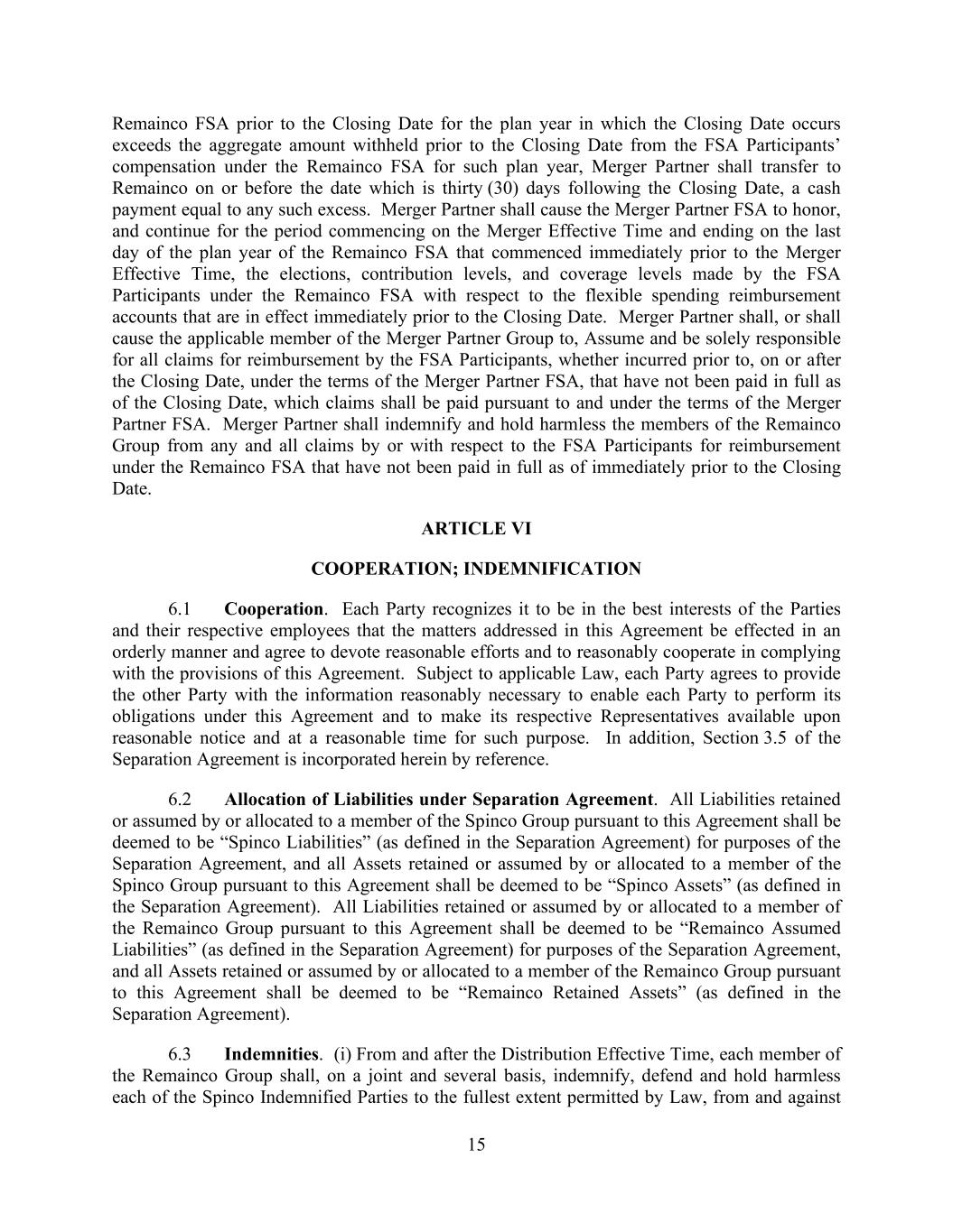 15 Remainco FSA prior to the Closing Date for the plan year in which the Closing Date occurs exceeds the aggregate amount withheld prior to the Closing Date from the FSA Participants’ compensation under the Remainco FSA for such plan year, Merger Partner shall transfer to Remainco on or before the date which is thirty (30) days following the Closing Date, a cash payment equal to any such excess. Merger Partner shall cause the Merger Partner FSA to honor, and continue for the period commencing on the Merger Effective Time and ending on the last day of the plan year of the Remainco FSA that commenced immediately prior to the Merger Effective Time, the elections, contribution levels, and coverage levels made by the FSA Participants under the Remainco FSA with respect to the flexible spending reimbursement accounts that are in effect immediately prior to the Closing Date. Merger Partner shall, or shall cause the applicable member of the Merger Partner Group to, Assume and be solely responsible for all claims for reimbursement by the FSA Participants, whether incurred prior to, on or after the Closing Date, under the terms of the Merger Partner FSA, that have not been paid in full as of the Closing Date, which claims shall be paid pursuant to and under the terms of the Merger Partner FSA. Merger Partner shall indemnify and hold harmless the members of the Remainco Group from any and all claims by or with respect to the FSA Participants for reimbursement under the Remainco FSA that have not been paid in full as of immediately prior to the Closing Date. ARTICLE VI COOPERATION; INDEMNIFICATION 6.1 Cooperation. Each Party recognizes it to be in the best interests of the Parties and their respective employees that the matters addressed in this Agreement be effected in an orderly manner and agree to devote reasonable efforts and to reasonably cooperate in complying with the provisions of this Agreement. Subject to applicable Law, each Party agrees to provide the other Party with the information reasonably necessary to enable each Party to perform its obligations under this Agreement and to make its respective Representatives available upon reasonable notice and at a reasonable time for such purpose. In addition, Section 3.5 of the Separation Agreement is incorporated herein by reference. 6.2 Allocation of Liabilities under Separation Agreement. All Liabilities retained or assumed by or allocated to a member of the Spinco Group pursuant to this Agreement shall be deemed to be “Spinco Liabilities” (as defined in the Separation Agreement) for purposes of the Separation Agreement, and all Assets retained or assumed by or allocated to a member of the Spinco Group pursuant to this Agreement shall be deemed to be “Spinco Assets” (as defined in the Separation Agreement). All Liabilities retained or assumed by or allocated to a member of the Remainco Group pursuant to this Agreement shall be deemed to be “Remainco Assumed Liabilities” (as defined in the Separation Agreement) for purposes of the Separation Agreement, and all Assets retained or assumed by or allocated to a member of the Remainco Group pursuant to this Agreement shall be deemed to be “Remainco Retained Assets” (as defined in the Separation Agreement). 6.3 Indemnities. (i) From and after the Distribution Effective Time, each member of the Remainco Group shall, on a joint and several basis, indemnify, defend and hold harmless each of the Spinco Indemnified Parties to the fullest extent permitted by Law, from and against