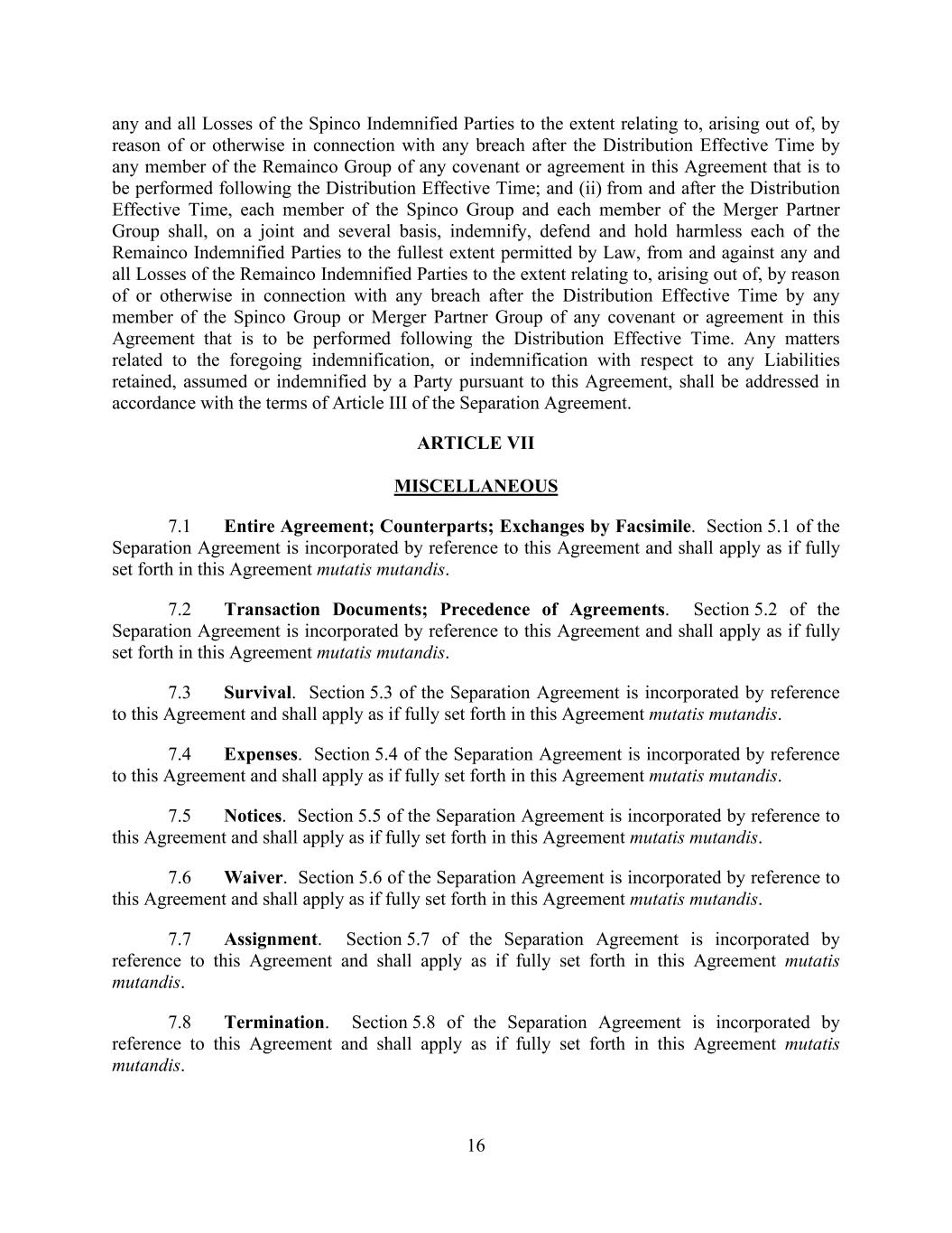 16 any and all Losses of the Spinco Indemnified Parties to the extent relating to, arising out of, by reason of or otherwise in connection with any breach after the Distribution Effective Time by any member of the Remainco Group of any covenant or agreement in this Agreement that is to be performed following the Distribution Effective Time; and (ii) from and after the Distribution Effective Time, each member of the Spinco Group and each member of the Merger Partner Group shall, on a joint and several basis, indemnify, defend and hold harmless each of the Remainco Indemnified Parties to the fullest extent permitted by Law, from and against any and all Losses of the Remainco Indemnified Parties to the extent relating to, arising out of, by reason of or otherwise in connection with any breach after the Distribution Effective Time by any member of the Spinco Group or Merger Partner Group of any covenant or agreement in this Agreement that is to be performed following the Distribution Effective Time. Any matters related to the foregoing indemnification, or indemnification with respect to any Liabilities retained, assumed or indemnified by a Party pursuant to this Agreement, shall be addressed in accordance with the terms of Article III of the Separation Agreement. ARTICLE VII MISCELLANEOUS 7.1 Entire Agreement; Counterparts; Exchanges by Facsimile. Section 5.1 of the Separation Agreement is incorporated by reference to this Agreement and shall apply as if fully set forth in this Agreement mutatis mutandis. 7.2 Transaction Documents; Precedence of Agreements. Section 5.2 of the Separation Agreement is incorporated by reference to this Agreement and shall apply as if fully set forth in this Agreement mutatis mutandis. 7.3 Survival. Section 5.3 of the Separation Agreement is incorporated by reference to this Agreement and shall apply as if fully set forth in this Agreement mutatis mutandis. 7.4 Expenses. Section 5.4 of the Separation Agreement is incorporated by reference to this Agreement and shall apply as if fully set forth in this Agreement mutatis mutandis. 7.5 Notices. Section 5.5 of the Separation Agreement is incorporated by reference to this Agreement and shall apply as if fully set forth in this Agreement mutatis mutandis. 7.6 Waiver. Section 5.6 of the Separation Agreement is incorporated by reference to this Agreement and shall apply as if fully set forth in this Agreement mutatis mutandis. 7.7 Assignment. Section 5.7 of the Separation Agreement is incorporated by reference to this Agreement and shall apply as if fully set forth in this Agreement mutatis mutandis. 7.8 Termination. Section 5.8 of the Separation Agreement is incorporated by reference to this Agreement and shall apply as if fully set forth in this Agreement mutatis mutandis.