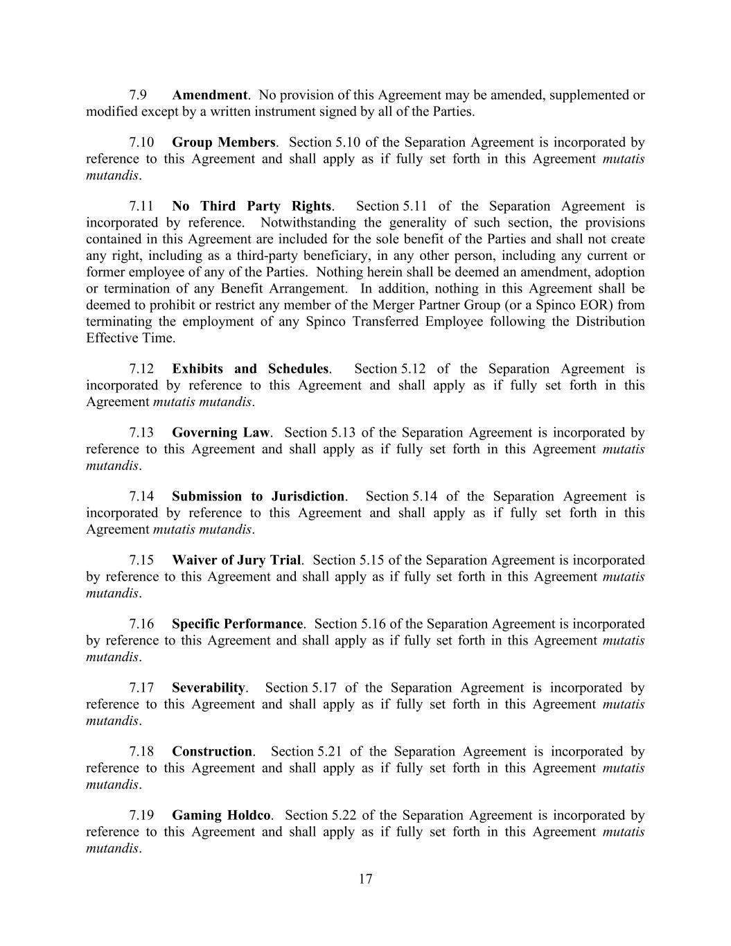 17 7.9 Amendment. No provision of this Agreement may be amended, supplemented or modified except by a written instrument signed by all of the Parties. 7.10 Group Members. Section 5.10 of the Separation Agreement is incorporated by reference to this Agreement and shall apply as if fully set forth in this Agreement mutatis mutandis. 7.11 No Third Party Rights. Section 5.11 of the Separation Agreement is incorporated by reference. Notwithstanding the generality of such section, the provisions contained in this Agreement are included for the sole benefit of the Parties and shall not create any right, including as a third-party beneficiary, in any other person, including any current or former employee of any of the Parties. Nothing herein shall be deemed an amendment, adoption or termination of any Benefit Arrangement. In addition, nothing in this Agreement shall be deemed to prohibit or restrict any member of the Merger Partner Group (or a Spinco EOR) from terminating the employment of any Spinco Transferred Employee following the Distribution Effective Time. 7.12 Exhibits and Schedules. Section 5.12 of the Separation Agreement is incorporated by reference to this Agreement and shall apply as if fully set forth in this Agreement mutatis mutandis. 7.13 Governing Law. Section 5.13 of the Separation Agreement is incorporated by reference to this Agreement and shall apply as if fully set forth in this Agreement mutatis mutandis. 7.14 Submission to Jurisdiction. Section 5.14 of the Separation Agreement is incorporated by reference to this Agreement and shall apply as if fully set forth in this Agreement mutatis mutandis. 7.15 Waiver of Jury Trial. Section 5.15 of the Separation Agreement is incorporated by reference to this Agreement and shall apply as if fully set forth in this Agreement mutatis mutandis. 7.16 Specific Performance. Section 5.16 of the Separation Agreement is incorporated by reference to this Agreement and shall apply as if fully set forth in this Agreement mutatis mutandis. 7.17 Severability. Section 5.17 of the Separation Agreement is incorporated by reference to this Agreement and shall apply as if fully set forth in this Agreement mutatis mutandis. 7.18 Construction. Section 5.21 of the Separation Agreement is incorporated by reference to this Agreement and shall apply as if fully set forth in this Agreement mutatis mutandis. 7.19 Gaming Holdco. Section 5.22 of the Separation Agreement is incorporated by reference to this Agreement and shall apply as if fully set forth in this Agreement mutatis mutandis.