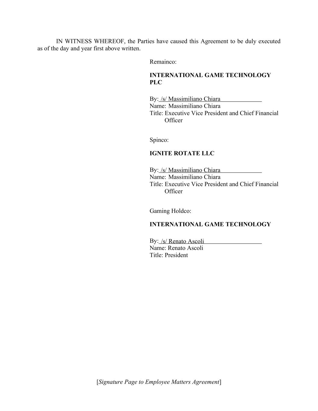 [Signature Page to Employee Matters Agreement] IN WITNESS WHEREOF, the Parties have caused this Agreement to be duly executed as of the day and year first above written. Remainco: INTERNATIONAL GAME TECHNOLOGY PLC By: Name: Massimiliano Chiara Title: Executive Vice President and Chief Financial Officer Spinco: IGNITE ROTATE LLC By: Name: Massimiliano Chiara Title: Executive Vice President and Chief Financial Officer Gaming Holdco: INTERNATIONAL GAME TECHNOLOGY By: Name: Renato Ascoli Title: President /s/ Massimiliano Chiara /s/ Massimiliano Chiara /s/ Renato Ascoli