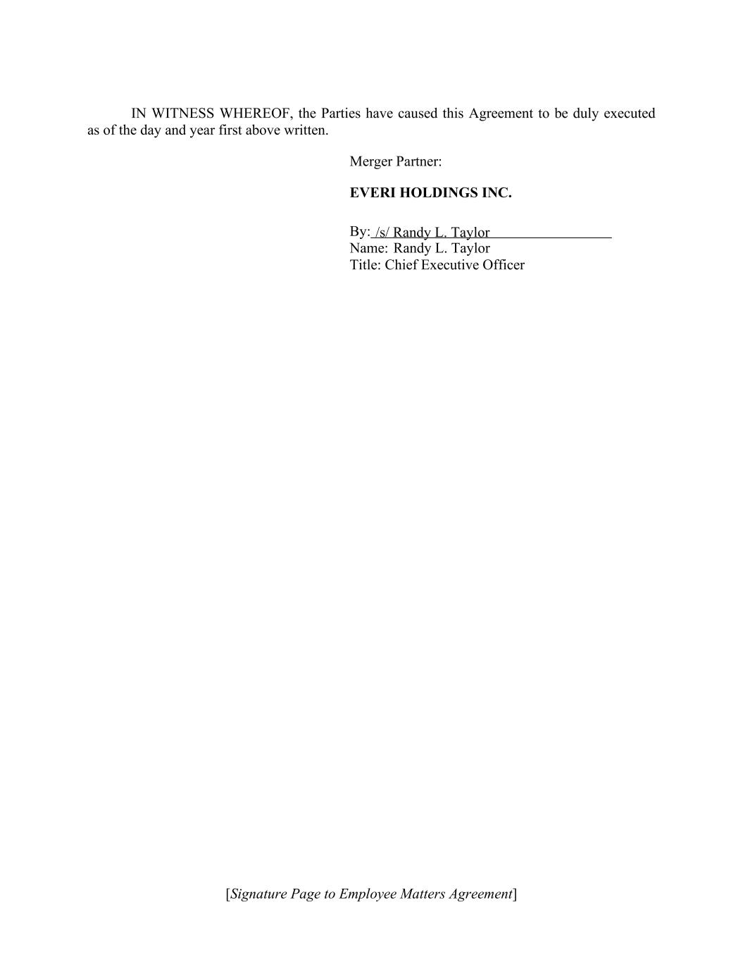 [Signature Page to Employee Matters Agreement] IN WITNESS WHEREOF, the Parties have caused this Agreement to be duly executed as of the day and year first above written. Merger Partner: EVERI HOLDINGS INC. By: Name: Randy L. Taylor Title: Chief Executive Officer /s/ Randy L. Taylor