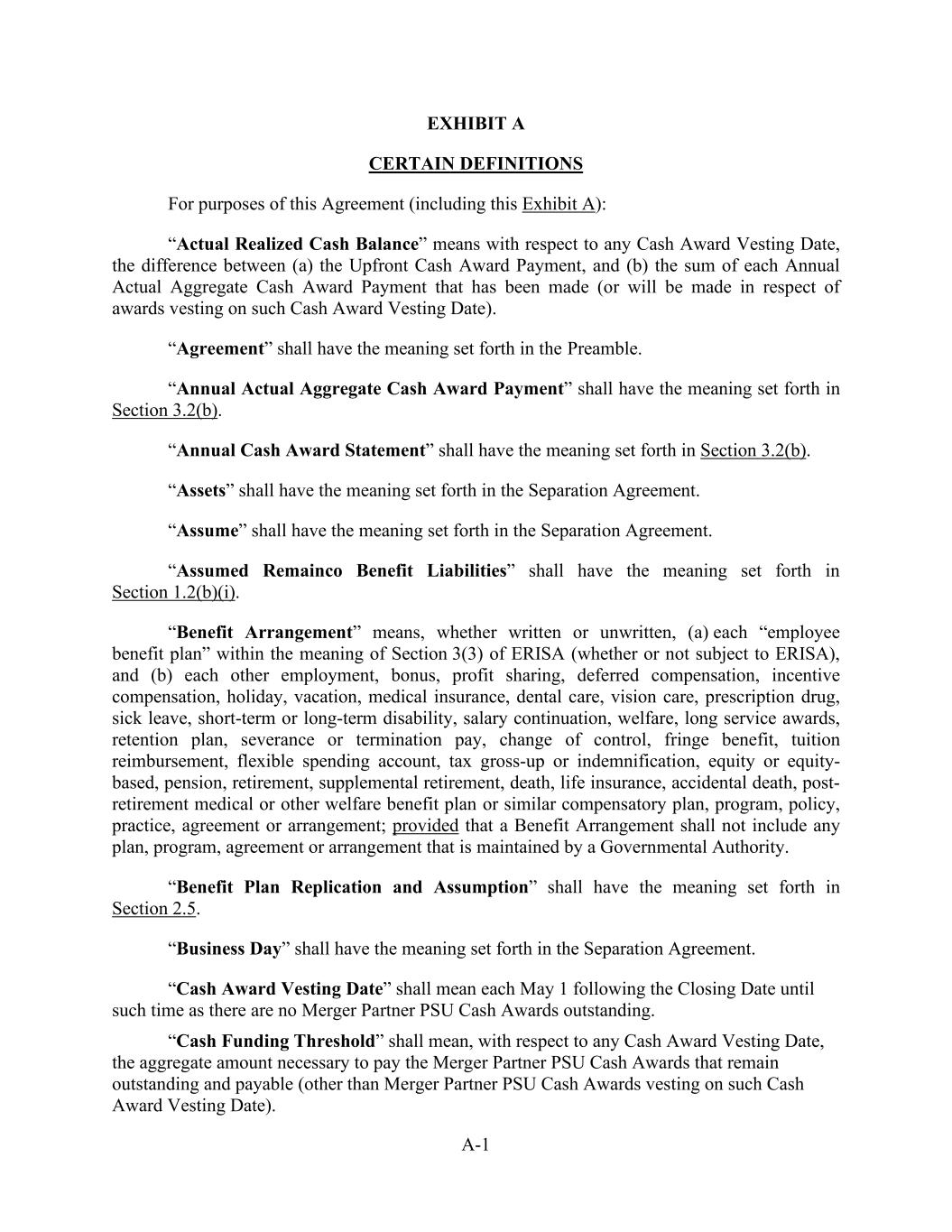 A-1 EXHIBIT A CERTAIN DEFINITIONS For purposes of this Agreement (including this Exhibit A): “Actual Realized Cash Balance” means with respect to any Cash Award Vesting Date, the difference between (a) the Upfront Cash Award Payment, and (b) the sum of each Annual Actual Aggregate Cash Award Payment that has been made (or will be made in respect of awards vesting on such Cash Award Vesting Date). “Agreement” shall have the meaning set forth in the Preamble. “Annual Actual Aggregate Cash Award Payment” shall have the meaning set forth in Section 3.2(b). “Annual Cash Award Statement” shall have the meaning set forth in Section 3.2(b). “Assets” shall have the meaning set forth in the Separation Agreement. “Assume” shall have the meaning set forth in the Separation Agreement. “Assumed Remainco Benefit Liabilities” shall have the meaning set forth in Section 1.2(b)(i). “Benefit Arrangement” means, whether written or unwritten, (a) each “employee benefit plan” within the meaning of Section 3(3) of ERISA (whether or not subject to ERISA), and (b) each other employment, bonus, profit sharing, deferred compensation, incentive compensation, holiday, vacation, medical insurance, dental care, vision care, prescription drug, sick leave, short-term or long-term disability, salary continuation, welfare, long service awards, retention plan, severance or termination pay, change of control, fringe benefit, tuition reimbursement, flexible spending account, tax gross-up or indemnification, equity or equity- based, pension, retirement, supplemental retirement, death, life insurance, accidental death, post- retirement medical or other welfare benefit plan or similar compensatory plan, program, policy, practice, agreement or arrangement; provided that a Benefit Arrangement shall not include any plan, program, agreement or arrangement that is maintained by a Governmental Authority. “Benefit Plan Replication and Assumption” shall have the meaning set forth in Section 2.5. “Business Day” shall have the meaning set forth in the Separation Agreement. “Cash Award Vesting Date” shall mean each May 1 following the Closing Date until such time as there are no Merger Partner PSU Cash Awards outstanding. “Cash Funding Threshold” shall mean, with respect to any Cash Award Vesting Date, the aggregate amount necessary to pay the Merger Partner PSU Cash Awards that remain outstanding and payable (other than Merger Partner PSU Cash Awards vesting on such Cash Award Vesting Date).