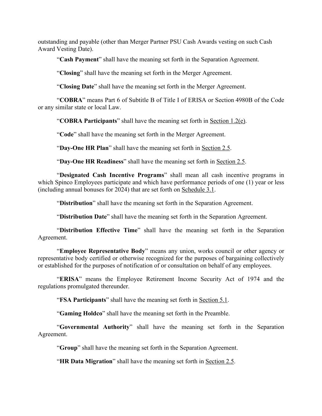 outstanding and payable (other than Merger Partner PSU Cash Awards vesting on such Cash Award Vesting Date). “Cash Payment” shall have the meaning set forth in the Separation Agreement. “Closing” shall have the meaning set forth in the Merger Agreement. “Closing Date” shall have the meaning set forth in the Merger Agreement. “COBRA” means Part 6 of Subtitle B of Title I of ERISA or Section 4980B of the Code or any similar state or local Law. “COBRA Participants” shall have the meaning set forth in Section 1.2(e). “Code” shall have the meaning set forth in the Merger Agreement. “Day-One HR Plan” shall have the meaning set forth in Section 2.5. “Day-One HR Readiness” shall have the meaning set forth in Section 2.5. “Designated Cash Incentive Programs” shall mean all cash incentive programs in which Spinco Employees participate and which have performance periods of one (1) year or less (including annual bonuses for 2024) that are set forth on Schedule 3.1. “Distribution” shall have the meaning set forth in the Separation Agreement. “Distribution Date” shall have the meaning set forth in the Separation Agreement. “Distribution Effective Time” shall have the meaning set forth in the Separation Agreement. “Employee Representative Body” means any union, works council or other agency or representative body certified or otherwise recognized for the purposes of bargaining collectively or established for the purposes of notification of or consultation on behalf of any employees. “ERISA” means the Employee Retirement Income Security Act of 1974 and the regulations promulgated thereunder. “FSA Participants” shall have the meaning set forth in Section 5.1. “Gaming Holdco” shall have the meaning set forth in the Preamble. “Governmental Authority” shall have the meaning set forth in the Separation Agreement. “Group” shall have the meaning set forth in the Separation Agreement. “HR Data Migration” shall have the meaning set forth in Section 2.5.