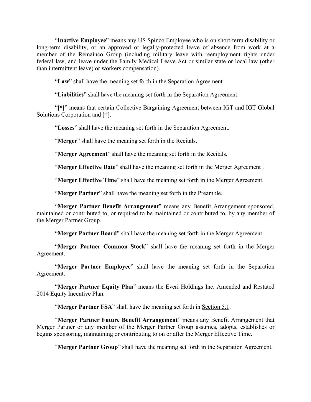 “Inactive Employee” means any US Spinco Employee who is on short-term disability or long-term disability, or an approved or legally-protected leave of absence from work at a member of the Remainco Group (including military leave with reemployment rights under federal law, and leave under the Family Medical Leave Act or similar state or local law (other than intermittent leave) or workers compensation). “Law” shall have the meaning set forth in the Separation Agreement. “Liabilities” shall have the meaning set forth in the Separation Agreement. “[*]” means that certain Collective Bargaining Agreement between IGT and IGT Global Solutions Corporation and [*]. “Losses” shall have the meaning set forth in the Separation Agreement. “Merger” shall have the meaning set forth in the Recitals. “Merger Agreement” shall have the meaning set forth in the Recitals. “Merger Effective Date” shall have the meaning set forth in the Merger Agreement . “Merger Effective Time” shall have the meaning set forth in the Merger Agreement. “Merger Partner” shall have the meaning set forth in the Preamble. “Merger Partner Benefit Arrangement” means any Benefit Arrangement sponsored, maintained or contributed to, or required to be maintained or contributed to, by any member of the Merger Partner Group. “Merger Partner Board” shall have the meaning set forth in the Merger Agreement. “Merger Partner Common Stock” shall have the meaning set forth in the Merger Agreement. “Merger Partner Employee” shall have the meaning set forth in the Separation Agreement. “Merger Partner Equity Plan” means the Everi Holdings Inc. Amended and Restated 2014 Equity Incentive Plan. “Merger Partner FSA” shall have the meaning set forth in Section 5.1. “Merger Partner Future Benefit Arrangement” means any Benefit Arrangement that Merger Partner or any member of the Merger Partner Group assumes, adopts, establishes or begins sponsoring, maintaining or contributing to on or after the Merger Effective Time. “Merger Partner Group” shall have the meaning set forth in the Separation Agreement.