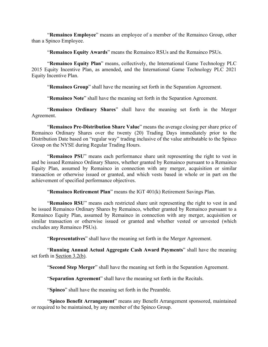 “Remainco Employee” means an employee of a member of the Remainco Group, other than a Spinco Employee. “Remainco Equity Awards” means the Remainco RSUs and the Remainco PSUs. “Remainco Equity Plan” means, collectively, the International Game Technology PLC 2015 Equity Incentive Plan, as amended, and the International Game Technology PLC 2021 Equity Incentive Plan. “Remainco Group” shall have the meaning set forth in the Separation Agreement. “Remainco Note” shall have the meaning set forth in the Separation Agreement. “Remainco Ordinary Shares” shall have the meaning set forth in the Merger Agreement. “Remainco Pre-Distribution Share Value” means the average closing per share price of Remainco Ordinary Shares over the twenty (20) Trading Days immediately prior to the Distribution Date based on “regular way” trading inclusive of the value attributable to the Spinco Group on the NYSE during Regular Trading Hours. “Remainco PSU” means each performance share unit representing the right to vest in and be issued Remainco Ordinary Shares, whether granted by Remainco pursuant to a Remainco Equity Plan, assumed by Remainco in connection with any merger, acquisition or similar transaction or otherwise issued or granted, and which vests based in whole or in part on the achievement of specified performance objectives. “Remainco Retirement Plan” means the IGT 401(k) Retirement Savings Plan. “Remainco RSU” means each restricted share unit representing the right to vest in and be issued Remainco Ordinary Shares by Remainco, whether granted by Remainco pursuant to a Remainco Equity Plan, assumed by Remainco in connection with any merger, acquisition or similar transaction or otherwise issued or granted and whether vested or unvested (which excludes any Remainco PSUs). “Representatives” shall have the meaning set forth in the Merger Agreement. “Running Annual Actual Aggregate Cash Award Payments” shall have the meaning set forth in Section 3.2(b). “Second Step Merger” shall have the meaning set forth in the Separation Agreement. “Separation Agreement” shall have the meaning set forth in the Recitals. “Spinco” shall have the meaning set forth in the Preamble. “Spinco Benefit Arrangement” means any Benefit Arrangement sponsored, maintained or required to be maintained, by any member of the Spinco Group.