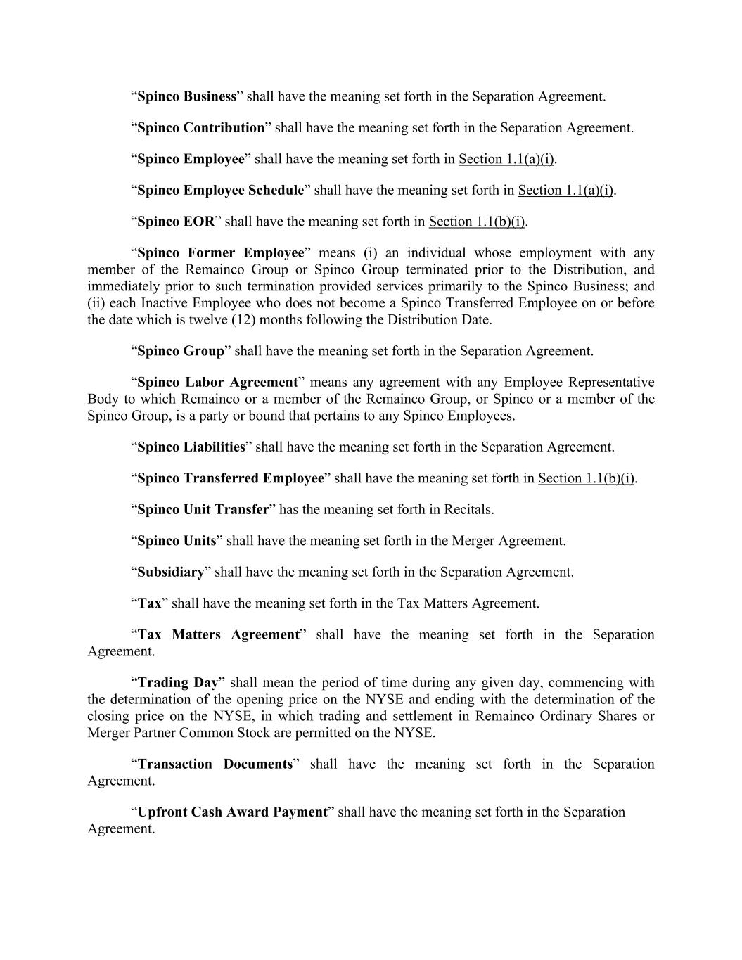 “Spinco Business” shall have the meaning set forth in the Separation Agreement. “Spinco Contribution” shall have the meaning set forth in the Separation Agreement. “Spinco Employee” shall have the meaning set forth in Section 1.1(a)(i). “Spinco Employee Schedule” shall have the meaning set forth in Section 1.1(a)(i). “Spinco EOR” shall have the meaning set forth in Section 1.1(b)(i). “Spinco Former Employee” means (i) an individual whose employment with any member of the Remainco Group or Spinco Group terminated prior to the Distribution, and immediately prior to such termination provided services primarily to the Spinco Business; and (ii) each Inactive Employee who does not become a Spinco Transferred Employee on or before the date which is twelve (12) months following the Distribution Date. “Spinco Group” shall have the meaning set forth in the Separation Agreement. “Spinco Labor Agreement” means any agreement with any Employee Representative Body to which Remainco or a member of the Remainco Group, or Spinco or a member of the Spinco Group, is a party or bound that pertains to any Spinco Employees. “Spinco Liabilities” shall have the meaning set forth in the Separation Agreement. “Spinco Transferred Employee” shall have the meaning set forth in Section 1.1(b)(i). “Spinco Unit Transfer” has the meaning set forth in Recitals. “Spinco Units” shall have the meaning set forth in the Merger Agreement. “Subsidiary” shall have the meaning set forth in the Separation Agreement. “Tax” shall have the meaning set forth in the Tax Matters Agreement. “Tax Matters Agreement” shall have the meaning set forth in the Separation Agreement. “Trading Day” shall mean the period of time during any given day, commencing with the determination of the opening price on the NYSE and ending with the determination of the closing price on the NYSE, in which trading and settlement in Remainco Ordinary Shares or Merger Partner Common Stock are permitted on the NYSE. “Transaction Documents” shall have the meaning set forth in the Separation Agreement. “Upfront Cash Award Payment” shall have the meaning set forth in the Separation Agreement.
