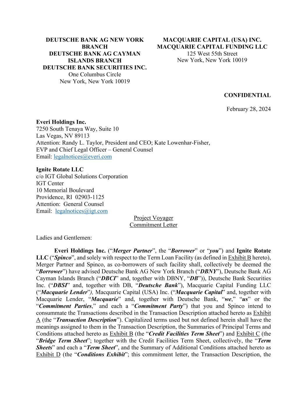DEUTSCHE BANK AG NEW YORK BRANCH DEUTSCHE BANK AG CAYMAN ISLANDS BRANCH DEUTSCHE BANK SECURITIES INC. One Columbus Circle New York, New York 10019 MACQUARIE CAPITAL (USA) INC. MACQUARIE CAPITAL FUNDING LLC 125 West 55th Street New York, New York 10019 CONFIDENTIAL February 28, 2024 Everi Holdings Inc. 7250 South Tenaya Way, Suite 10 Las Vegas, NV 89113 Attention: Randy L. Taylor, President and CEO; Kate Lowenhar-Fisher, EVP and Chief Legal Officer – General Counsel Email: legalnotices@everi.com Ignite Rotate LLC c/o IGT Global Solutions Corporation IGT Center 10 Memorial Boulevard Providence, RI 02903-1125 Attention: General Counsel Email: legalnotices@igt.com Project Voyager Commitment Letter Ladies and Gentlemen: Everi Holdings Inc. (“Merger Partner”, the “Borrower” or “you”) and Ignite Rotate LLC (“Spinco”, and solely with respect to the Term Loan Facility (as defined in Exhibit B hereto), Merger Partner and Spinco, as co-borrowers of such facility shall, collectively be deemed the “Borrower”) have advised Deutsche Bank AG New York Branch (“DBNY”), Deutsche Bank AG Cayman Islands Branch (“DBCI” and, together with DBNY, “DB”)), Deutsche Bank Securities Inc. (“DBSI” and, together with DB, “Deutsche Bank”), Macquarie Capital Funding LLC (“Macquarie Lender”), Macquarie Capital (USA) Inc. (“Macquarie Capital” and, together with Macquarie Lender, “Macquarie” and, together with Deutsche Bank, “we,” “us” or the “Commitment Parties,” and each a “Commitment Party”) that you and Spinco intend to consummate the Transactions described in the Transaction Description attached hereto as Exhibit A (the “Transaction Description”). Capitalized terms used but not defined herein shall have the meanings assigned to them in the Transaction Description, the Summaries of Principal Terms and Conditions attached hereto as Exhibit B (the “Credit Facilities Term Sheet”) and Exhibit C (the “Bridge Term Sheet”; together with the Credit Facilities Term Sheet, collectively, the “Term Sheets” and each a “Term Sheet”, and the Summary of Additional Conditions attached hereto as Exhibit D (the “Conditions Exhibit”; this commitment letter, the Transaction Description, the