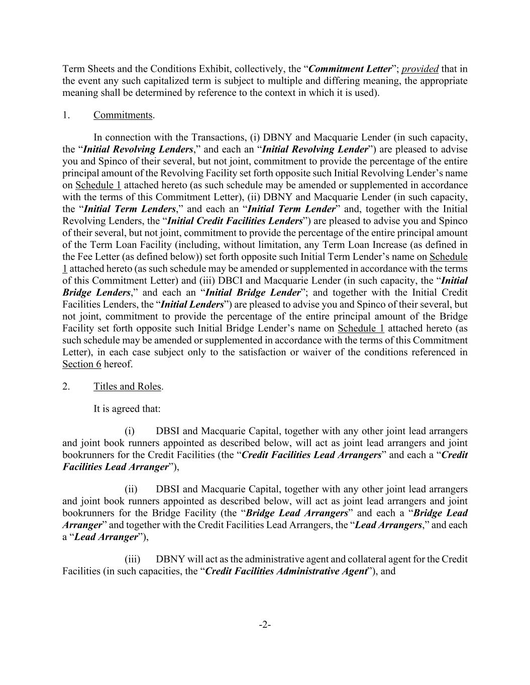 -2- Term Sheets and the Conditions Exhibit, collectively, the “Commitment Letter”; provided that in the event any such capitalized term is subject to multiple and differing meaning, the appropriate meaning shall be determined by reference to the context in which it is used). 1. Commitments. In connection with the Transactions, (i) DBNY and Macquarie Lender (in such capacity, the “Initial Revolving Lenders,” and each an “Initial Revolving Lender”) are pleased to advise you and Spinco of their several, but not joint, commitment to provide the percentage of the entire principal amount of the Revolving Facility set forth opposite such Initial Revolving Lender’s name on Schedule 1 attached hereto (as such schedule may be amended or supplemented in accordance with the terms of this Commitment Letter), (ii) DBNY and Macquarie Lender (in such capacity, the “Initial Term Lenders,” and each an “Initial Term Lender” and, together with the Initial Revolving Lenders, the “Initial Credit Facilities Lenders”) are pleased to advise you and Spinco of their several, but not joint, commitment to provide the percentage of the entire principal amount of the Term Loan Facility (including, without limitation, any Term Loan Increase (as defined in the Fee Letter (as defined below)) set forth opposite such Initial Term Lender’s name on Schedule 1 attached hereto (as such schedule may be amended or supplemented in accordance with the terms of this Commitment Letter) and (iii) DBCI and Macquarie Lender (in such capacity, the “Initial Bridge Lenders,” and each an “Initial Bridge Lender”; and together with the Initial Credit Facilities Lenders, the “Initial Lenders”) are pleased to advise you and Spinco of their several, but not joint, commitment to provide the percentage of the entire principal amount of the Bridge Facility set forth opposite such Initial Bridge Lender’s name on Schedule 1 attached hereto (as such schedule may be amended or supplemented in accordance with the terms of this Commitment Letter), in each case subject only to the satisfaction or waiver of the conditions referenced in Section 6 hereof. 2. Titles and Roles. It is agreed that: (i) DBSI and Macquarie Capital, together with any other joint lead arrangers and joint book runners appointed as described below, will act as joint lead arrangers and joint bookrunners for the Credit Facilities (the “Credit Facilities Lead Arrangers” and each a “Credit Facilities Lead Arranger”), (ii) DBSI and Macquarie Capital, together with any other joint lead arrangers and joint book runners appointed as described below, will act as joint lead arrangers and joint bookrunners for the Bridge Facility (the “Bridge Lead Arrangers” and each a “Bridge Lead Arranger” and together with the Credit Facilities Lead Arrangers, the “Lead Arrangers,” and each a “Lead Arranger”), (iii) DBNY will act as the administrative agent and collateral agent for the Credit Facilities (in such capacities, the “Credit Facilities Administrative Agent”), and
