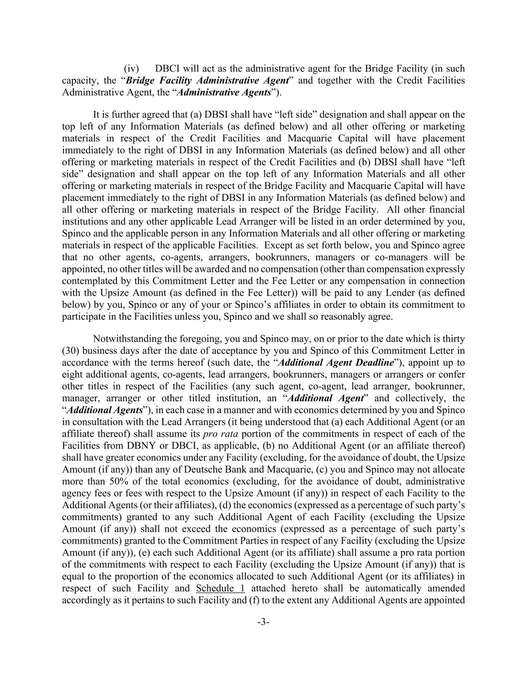 -3- (iv) DBCI will act as the administrative agent for the Bridge Facility (in such capacity, the “Bridge Facility Administrative Agent” and together with the Credit Facilities Administrative Agent, the “Administrative Agents”). It is further agreed that (a) DBSI shall have “left side” designation and shall appear on the top left of any Information Materials (as defined below) and all other offering or marketing materials in respect of the Credit Facilities and Macquarie Capital will have placement immediately to the right of DBSI in any Information Materials (as defined below) and all other offering or marketing materials in respect of the Credit Facilities and (b) DBSI shall have “left side” designation and shall appear on the top left of any Information Materials and all other offering or marketing materials in respect of the Bridge Facility and Macquarie Capital will have placement immediately to the right of DBSI in any Information Materials (as defined below) and all other offering or marketing materials in respect of the Bridge Facility. All other financial institutions and any other applicable Lead Arranger will be listed in an order determined by you, Spinco and the applicable person in any Information Materials and all other offering or marketing materials in respect of the applicable Facilities. Except as set forth below, you and Spinco agree that no other agents, co-agents, arrangers, bookrunners, managers or co-managers will be appointed, no other titles will be awarded and no compensation (other than compensation expressly contemplated by this Commitment Letter and the Fee Letter or any compensation in connection with the Upsize Amount (as defined in the Fee Letter)) will be paid to any Lender (as defined below) by you, Spinco or any of your or Spinco’s affiliates in order to obtain its commitment to participate in the Facilities unless you, Spinco and we shall so reasonably agree. Notwithstanding the foregoing, you and Spinco may, on or prior to the date which is thirty (30) business days after the date of acceptance by you and Spinco of this Commitment Letter in accordance with the terms hereof (such date, the “Additional Agent Deadline”), appoint up to eight additional agents, co-agents, lead arrangers, bookrunners, managers or arrangers or confer other titles in respect of the Facilities (any such agent, co-agent, lead arranger, bookrunner, manager, arranger or other titled institution, an “Additional Agent” and collectively, the “Additional Agents”), in each case in a manner and with economics determined by you and Spinco in consultation with the Lead Arrangers (it being understood that (a) each Additional Agent (or an affiliate thereof) shall assume its pro rata portion of the commitments in respect of each of the Facilities from DBNY or DBCI, as applicable, (b) no Additional Agent (or an affiliate thereof) shall have greater economics under any Facility (excluding, for the avoidance of doubt, the Upsize Amount (if any)) than any of Deutsche Bank and Macquarie, (c) you and Spinco may not allocate more than 50% of the total economics (excluding, for the avoidance of doubt, administrative agency fees or fees with respect to the Upsize Amount (if any)) in respect of each Facility to the Additional Agents (or their affiliates), (d) the economics (expressed as a percentage of such party’s commitments) granted to any such Additional Agent of each Facility (excluding the Upsize Amount (if any)) shall not exceed the economics (expressed as a percentage of such party’s commitments) granted to the Commitment Parties in respect of any Facility (excluding the Upsize Amount (if any)), (e) each such Additional Agent (or its affiliate) shall assume a pro rata portion of the commitments with respect to each Facility (excluding the Upsize Amount (if any)) that is equal to the proportion of the economics allocated to such Additional Agent (or its affiliates) in respect of such Facility and Schedule 1 attached hereto shall be automatically amended accordingly as it pertains to such Facility and (f) to the extent any Additional Agents are appointed