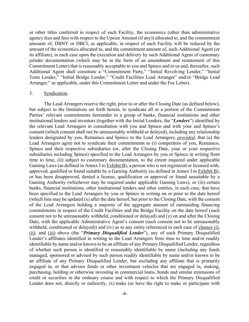 -4- or other titles conferred in respect of each Facility, the economics (other than administrative agency fees and fees with respect to the Upsize Amount (if any)) allocated to, and the commitment amounts of, DBNY or DBCI, as applicable, in respect of each Facility will be reduced by the amount of the economics allocated to, and the commitment amount of, such Additional Agent (or its affiliate), in each case upon the execution and delivery by such Additional Agent of customary joinder documentation (which may be in the form of an amendment and restatement of this Commitment Letter) that is reasonably acceptable to you and Spinco and to us and, thereafter, such Additional Agent shall constitute a “Commitment Party,” “Initial Revolving Lender,” “Initial Term Lender,” “Initial Bridge Lender,” “Credit Facilities Lead Arranger” and/or “Bridge Lead Arranger,” as applicable, under this Commitment Letter and under the Fee Letter). 3. Syndication. The Lead Arrangers reserve the right, prior to or after the Closing Date (as defined below), but subject to the limitations set forth herein, to syndicate all or a portion of the Commitment Parties’ relevant commitments hereunder to a group of banks, financial institutions and other institutional lenders and investors (together with the Initial Lenders, the “Lenders”) identified by the relevant Lead Arrangers in consultation with you and Spinco and with your and Spinco’s consent (which consent shall not be unreasonably withheld or delayed), including any relationship lenders designated by you, Remainco and Spinco to the Lead Arrangers; provided, that (a) the Lead Arrangers agree not to syndicate their commitments to (i) competitors of you, Remainco, Spinco and their respective subsidiaries (or, after the Closing Date, your or your respective subsidiaries including Spinco) specified to the Lead Arrangers by you or Spinco in writing from time to time, (ii) subject to customary documentation, to the extent required under applicable Gaming Laws (as defined in Annex I to Exhibit B), a person who is not registered or licensed with, approved, qualified or found suitable by a Gaming Authority (as defined in Annex I to Exhibit B), or has been disapproved, denied a license, qualification or approval or found unsuitable by a Gaming Authority (whichever may be required under applicable Gaming Laws), or (iii) certain banks, financial institutions, other institutional lenders and other entities, in each case, that have been specified to the Lead Arrangers by you or Spinco in writing on or prior to the date hereof (which lists may be updated (x) after the date hereof, but prior to the Closing Date, with the consent of the Lead Arrangers holding a majority of the aggregate amount of outstanding financing commitments in respect of the Credit Facilities and the Bridge Facility on the date hereof (such consent not to be unreasonably withheld, conditioned or delayed) and (y) on and after the Closing Date, with the applicable Administrative Agent’s consent (such consent not to be unreasonably withheld, conditioned or delayed)) and (iv) as to any entity referenced in each case of clauses (i), (ii), and (iii) above (the “Primary Disqualified Lender”), any of such Primary Disqualified Lender’s affiliates identified in writing to the Lead Arrangers from time to time and/or readily identifiable by name and/or known to be an affiliate of any Primary Disqualified Lender, regardless of whether such person is identified or reasonably identifiable by name (including any funds managed, sponsored or advised by such person readily identifiable by name and/or known to be an affiliate of any Primary Disqualified Lender, but excluding any affiliate that is primarily engaged in, or that advises funds or other investment vehicles that are engaged in, making, purchasing, holding or otherwise investing in commercial loans, bonds and similar extensions of credit or securities in the ordinary course and with respect to which the Primary Disqualified Lender does not, directly or indirectly, (x) make (or have the right to make or participate with