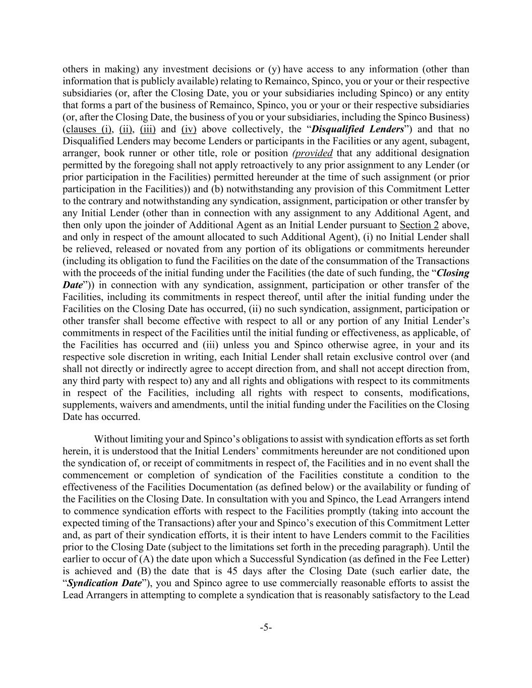 -5- others in making) any investment decisions or (y) have access to any information (other than information that is publicly available) relating to Remainco, Spinco, you or your or their respective subsidiaries (or, after the Closing Date, you or your subsidiaries including Spinco) or any entity that forms a part of the business of Remainco, Spinco, you or your or their respective subsidiaries (or, after the Closing Date, the business of you or your subsidiaries, including the Spinco Business) (clauses (i), (ii), (iii) and (iv) above collectively, the “Disqualified Lenders”) and that no Disqualified Lenders may become Lenders or participants in the Facilities or any agent, subagent, arranger, book runner or other title, role or position (provided that any additional designation permitted by the foregoing shall not apply retroactively to any prior assignment to any Lender (or prior participation in the Facilities) permitted hereunder at the time of such assignment (or prior participation in the Facilities)) and (b) notwithstanding any provision of this Commitment Letter to the contrary and notwithstanding any syndication, assignment, participation or other transfer by any Initial Lender (other than in connection with any assignment to any Additional Agent, and then only upon the joinder of Additional Agent as an Initial Lender pursuant to Section 2 above, and only in respect of the amount allocated to such Additional Agent), (i) no Initial Lender shall be relieved, released or novated from any portion of its obligations or commitments hereunder (including its obligation to fund the Facilities on the date of the consummation of the Transactions with the proceeds of the initial funding under the Facilities (the date of such funding, the “Closing Date”)) in connection with any syndication, assignment, participation or other transfer of the Facilities, including its commitments in respect thereof, until after the initial funding under the Facilities on the Closing Date has occurred, (ii) no such syndication, assignment, participation or other transfer shall become effective with respect to all or any portion of any Initial Lender’s commitments in respect of the Facilities until the initial funding or effectiveness, as applicable, of the Facilities has occurred and (iii) unless you and Spinco otherwise agree, in your and its respective sole discretion in writing, each Initial Lender shall retain exclusive control over (and shall not directly or indirectly agree to accept direction from, and shall not accept direction from, any third party with respect to) any and all rights and obligations with respect to its commitments in respect of the Facilities, including all rights with respect to consents, modifications, supplements, waivers and amendments, until the initial funding under the Facilities on the Closing Date has occurred. Without limiting your and Spinco’s obligations to assist with syndication efforts as set forth herein, it is understood that the Initial Lenders’ commitments hereunder are not conditioned upon the syndication of, or receipt of commitments in respect of, the Facilities and in no event shall the commencement or completion of syndication of the Facilities constitute a condition to the effectiveness of the Facilities Documentation (as defined below) or the availability or funding of the Facilities on the Closing Date. In consultation with you and Spinco, the Lead Arrangers intend to commence syndication efforts with respect to the Facilities promptly (taking into account the expected timing of the Transactions) after your and Spinco’s execution of this Commitment Letter and, as part of their syndication efforts, it is their intent to have Lenders commit to the Facilities prior to the Closing Date (subject to the limitations set forth in the preceding paragraph). Until the earlier to occur of (A) the date upon which a Successful Syndication (as defined in the Fee Letter) is achieved and (B) the date that is 45 days after the Closing Date (such earlier date, the “Syndication Date”), you and Spinco agree to use commercially reasonable efforts to assist the Lead Arrangers in attempting to complete a syndication that is reasonably satisfactory to the Lead