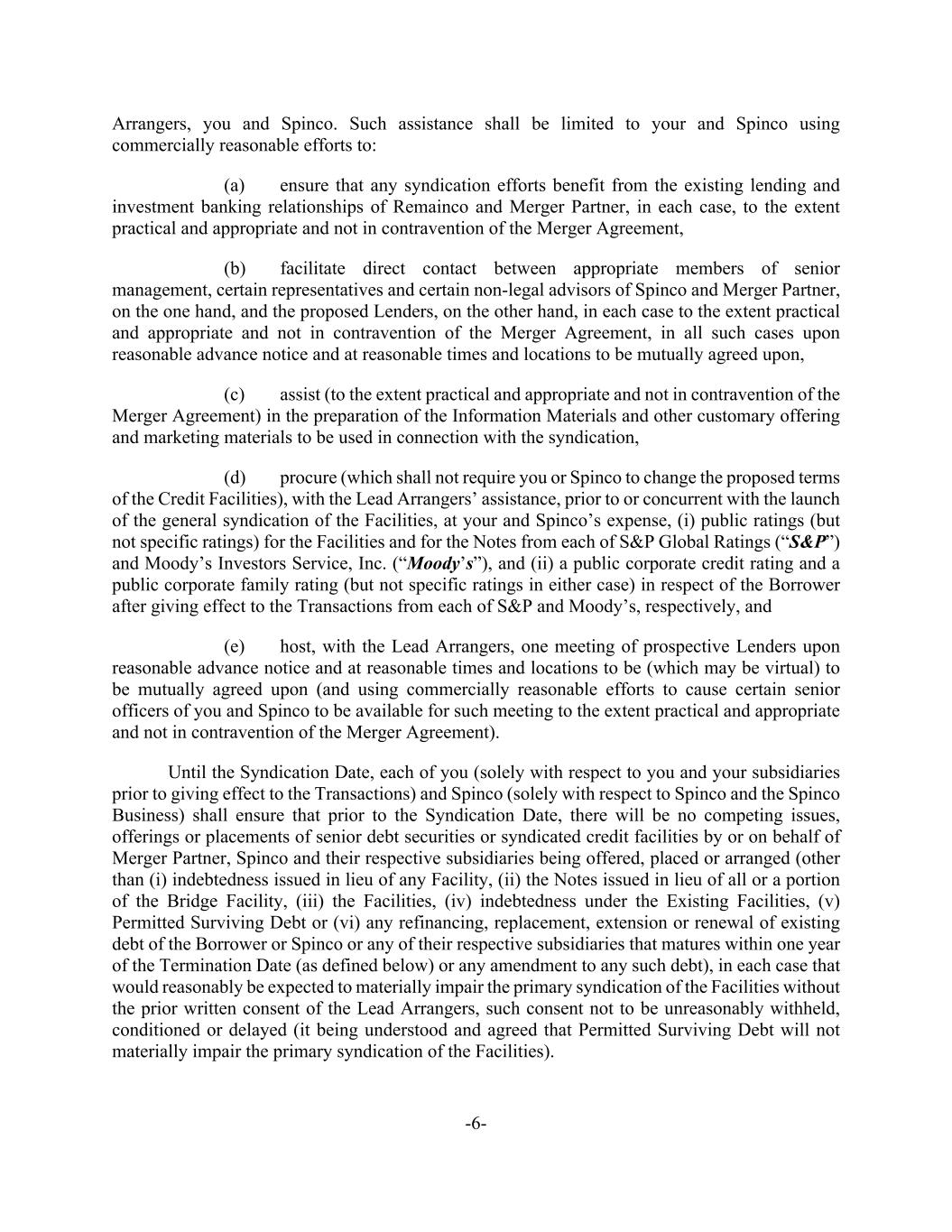 -6- Arrangers, you and Spinco. Such assistance shall be limited to your and Spinco using commercially reasonable efforts to: (a) ensure that any syndication efforts benefit from the existing lending and investment banking relationships of Remainco and Merger Partner, in each case, to the extent practical and appropriate and not in contravention of the Merger Agreement, (b) facilitate direct contact between appropriate members of senior management, certain representatives and certain non-legal advisors of Spinco and Merger Partner, on the one hand, and the proposed Lenders, on the other hand, in each case to the extent practical and appropriate and not in contravention of the Merger Agreement, in all such cases upon reasonable advance notice and at reasonable times and locations to be mutually agreed upon, (c) assist (to the extent practical and appropriate and not in contravention of the Merger Agreement) in the preparation of the Information Materials and other customary offering and marketing materials to be used in connection with the syndication, (d) procure (which shall not require you or Spinco to change the proposed terms of the Credit Facilities), with the Lead Arrangers’ assistance, prior to or concurrent with the launch of the general syndication of the Facilities, at your and Spinco’s expense, (i) public ratings (but not specific ratings) for the Facilities and for the Notes from each of S&P Global Ratings (“S&P”) and Moody’s Investors Service, Inc. (“Moody’s”), and (ii) a public corporate credit rating and a public corporate family rating (but not specific ratings in either case) in respect of the Borrower after giving effect to the Transactions from each of S&P and Moody’s, respectively, and (e) host, with the Lead Arrangers, one meeting of prospective Lenders upon reasonable advance notice and at reasonable times and locations to be (which may be virtual) to be mutually agreed upon (and using commercially reasonable efforts to cause certain senior officers of you and Spinco to be available for such meeting to the extent practical and appropriate and not in contravention of the Merger Agreement). Until the Syndication Date, each of you (solely with respect to you and your subsidiaries prior to giving effect to the Transactions) and Spinco (solely with respect to Spinco and the Spinco Business) shall ensure that prior to the Syndication Date, there will be no competing issues, offerings or placements of senior debt securities or syndicated credit facilities by or on behalf of Merger Partner, Spinco and their respective subsidiaries being offered, placed or arranged (other than (i) indebtedness issued in lieu of any Facility, (ii) the Notes issued in lieu of all or a portion of the Bridge Facility, (iii) the Facilities, (iv) indebtedness under the Existing Facilities, (v) Permitted Surviving Debt or (vi) any refinancing, replacement, extension or renewal of existing debt of the Borrower or Spinco or any of their respective subsidiaries that matures within one year of the Termination Date (as defined below) or any amendment to any such debt), in each case that would reasonably be expected to materially impair the primary syndication of the Facilities without the prior written consent of the Lead Arrangers, such consent not to be unreasonably withheld, conditioned or delayed (it being understood and agreed that Permitted Surviving Debt will not materially impair the primary syndication of the Facilities).