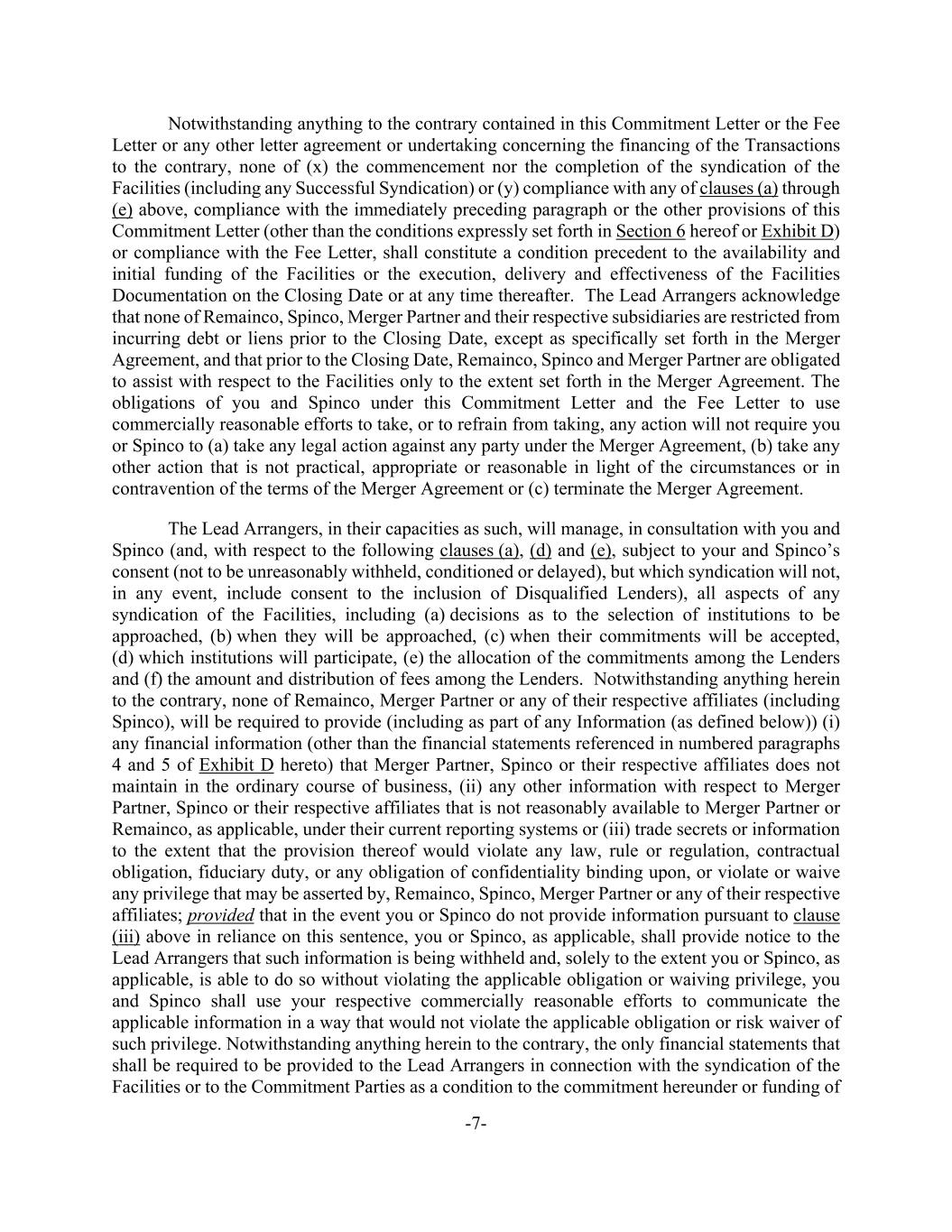 -7- Notwithstanding anything to the contrary contained in this Commitment Letter or the Fee Letter or any other letter agreement or undertaking concerning the financing of the Transactions to the contrary, none of (x) the commencement nor the completion of the syndication of the Facilities (including any Successful Syndication) or (y) compliance with any of clauses (a) through (e) above, compliance with the immediately preceding paragraph or the other provisions of this Commitment Letter (other than the conditions expressly set forth in Section 6 hereof or Exhibit D) or compliance with the Fee Letter, shall constitute a condition precedent to the availability and initial funding of the Facilities or the execution, delivery and effectiveness of the Facilities Documentation on the Closing Date or at any time thereafter. The Lead Arrangers acknowledge that none of Remainco, Spinco, Merger Partner and their respective subsidiaries are restricted from incurring debt or liens prior to the Closing Date, except as specifically set forth in the Merger Agreement, and that prior to the Closing Date, Remainco, Spinco and Merger Partner are obligated to assist with respect to the Facilities only to the extent set forth in the Merger Agreement. The obligations of you and Spinco under this Commitment Letter and the Fee Letter to use commercially reasonable efforts to take, or to refrain from taking, any action will not require you or Spinco to (a) take any legal action against any party under the Merger Agreement, (b) take any other action that is not practical, appropriate or reasonable in light of the circumstances or in contravention of the terms of the Merger Agreement or (c) terminate the Merger Agreement. The Lead Arrangers, in their capacities as such, will manage, in consultation with you and Spinco (and, with respect to the following clauses (a), (d) and (e), subject to your and Spinco’s consent (not to be unreasonably withheld, conditioned or delayed), but which syndication will not, in any event, include consent to the inclusion of Disqualified Lenders), all aspects of any syndication of the Facilities, including (a) decisions as to the selection of institutions to be approached, (b) when they will be approached, (c) when their commitments will be accepted, (d) which institutions will participate, (e) the allocation of the commitments among the Lenders and (f) the amount and distribution of fees among the Lenders. Notwithstanding anything herein to the contrary, none of Remainco, Merger Partner or any of their respective affiliates (including Spinco), will be required to provide (including as part of any Information (as defined below)) (i) any financial information (other than the financial statements referenced in numbered paragraphs 4 and 5 of Exhibit D hereto) that Merger Partner, Spinco or their respective affiliates does not maintain in the ordinary course of business, (ii) any other information with respect to Merger Partner, Spinco or their respective affiliates that is not reasonably available to Merger Partner or Remainco, as applicable, under their current reporting systems or (iii) trade secrets or information to the extent that the provision thereof would violate any law, rule or regulation, contractual obligation, fiduciary duty, or any obligation of confidentiality binding upon, or violate or waive any privilege that may be asserted by, Remainco, Spinco, Merger Partner or any of their respective affiliates; provided that in the event you or Spinco do not provide information pursuant to clause (iii) above in reliance on this sentence, you or Spinco, as applicable, shall provide notice to the Lead Arrangers that such information is being withheld and, solely to the extent you or Spinco, as applicable, is able to do so without violating the applicable obligation or waiving privilege, you and Spinco shall use your respective commercially reasonable efforts to communicate the applicable information in a way that would not violate the applicable obligation or risk waiver of such privilege. Notwithstanding anything herein to the contrary, the only financial statements that shall be required to be provided to the Lead Arrangers in connection with the syndication of the Facilities or to the Commitment Parties as a condition to the commitment hereunder or funding of