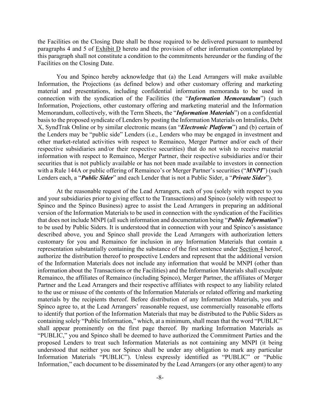 -8- the Facilities on the Closing Date shall be those required to be delivered pursuant to numbered paragraphs 4 and 5 of Exhibit D hereto and the provision of other information contemplated by this paragraph shall not constitute a condition to the commitments hereunder or the funding of the Facilities on the Closing Date. You and Spinco hereby acknowledge that (a) the Lead Arrangers will make available Information, the Projections (as defined below) and other customary offering and marketing material and presentations, including confidential information memoranda to be used in connection with the syndication of the Facilities (the “Information Memorandum”) (such Information, Projections, other customary offering and marketing material and the Information Memorandum, collectively, with the Term Sheets, the “Information Materials”) on a confidential basis to the proposed syndicate of Lenders by posting the Information Materials on Intralinks, Debt X, SyndTrak Online or by similar electronic means (an “Electronic Platform”) and (b) certain of the Lenders may be “public side” Lenders (i.e., Lenders who may be engaged in investment and other market-related activities with respect to Remainco, Merger Partner and/or each of their respective subsidiaries and/or their respective securities) that do not wish to receive material information with respect to Remainco, Merger Partner, their respective subsidiaries and/or their securities that is not publicly available or has not been made available to investors in connection with a Rule 144A or public offering of Remainco’s or Merger Partner’s securities (“MNPI”) (such Lenders each, a “Public Sider” and each Lender that is not a Public Sider, a “Private Sider”). At the reasonable request of the Lead Arrangers, each of you (solely with respect to you and your subsidiaries prior to giving effect to the Transactions) and Spinco (solely with respect to Spinco and the Spinco Business) agree to assist the Lead Arrangers in preparing an additional version of the Information Materials to be used in connection with the syndication of the Facilities that does not include MNPI (all such information and documentation being “Public Information”) to be used by Public Siders. It is understood that in connection with your and Spinco’s assistance described above, you and Spinco shall provide the Lead Arrangers with authorization letters customary for you and Remainco for inclusion in any Information Materials that contain a representation substantially containing the substance of the first sentence under Section 4 hereof, authorize the distribution thereof to prospective Lenders and represent that the additional version of the Information Materials does not include any information that would be MNPI (other than information about the Transactions or the Facilities) and the Information Materials shall exculpate Remainco, the affiliates of Remainco (including Spinco), Merger Partner, the affiliates of Merger Partner and the Lead Arrangers and their respective affiliates with respect to any liability related to the use or misuse of the contents of the Information Materials or related offering and marketing materials by the recipients thereof. Before distribution of any Information Materials, you and Spinco agree to, at the Lead Arrangers’ reasonable request, use commercially reasonable efforts to identify that portion of the Information Materials that may be distributed to the Public Siders as containing solely “Public Information,” which, at a minimum, shall mean that the word “PUBLIC” shall appear prominently on the first page thereof. By marking Information Materials as “PUBLIC,” you and Spinco shall be deemed to have authorized the Commitment Parties and the proposed Lenders to treat such Information Materials as not containing any MNPI (it being understood that neither you nor Spinco shall be under any obligation to mark any particular Information Materials “PUBLIC”). Unless expressly identified as “PUBLIC” or “Public Information,” each document to be disseminated by the Lead Arrangers (or any other agent) to any