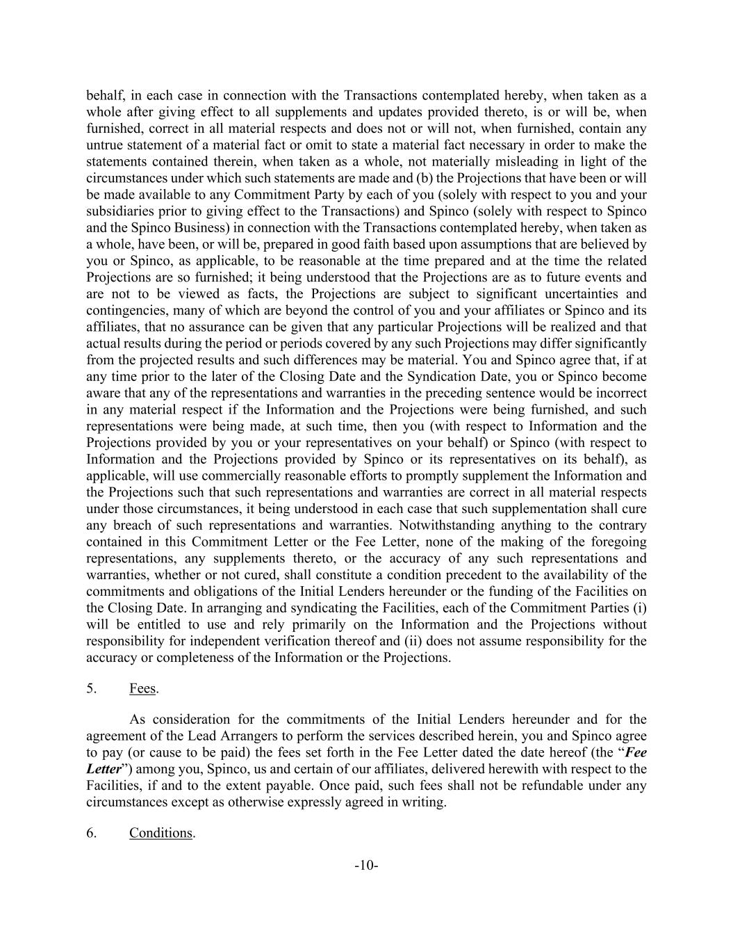 -10- behalf, in each case in connection with the Transactions contemplated hereby, when taken as a whole after giving effect to all supplements and updates provided thereto, is or will be, when furnished, correct in all material respects and does not or will not, when furnished, contain any untrue statement of a material fact or omit to state a material fact necessary in order to make the statements contained therein, when taken as a whole, not materially misleading in light of the circumstances under which such statements are made and (b) the Projections that have been or will be made available to any Commitment Party by each of you (solely with respect to you and your subsidiaries prior to giving effect to the Transactions) and Spinco (solely with respect to Spinco and the Spinco Business) in connection with the Transactions contemplated hereby, when taken as a whole, have been, or will be, prepared in good faith based upon assumptions that are believed by you or Spinco, as applicable, to be reasonable at the time prepared and at the time the related Projections are so furnished; it being understood that the Projections are as to future events and are not to be viewed as facts, the Projections are subject to significant uncertainties and contingencies, many of which are beyond the control of you and your affiliates or Spinco and its affiliates, that no assurance can be given that any particular Projections will be realized and that actual results during the period or periods covered by any such Projections may differ significantly from the projected results and such differences may be material. You and Spinco agree that, if at any time prior to the later of the Closing Date and the Syndication Date, you or Spinco become aware that any of the representations and warranties in the preceding sentence would be incorrect in any material respect if the Information and the Projections were being furnished, and such representations were being made, at such time, then you (with respect to Information and the Projections provided by you or your representatives on your behalf) or Spinco (with respect to Information and the Projections provided by Spinco or its representatives on its behalf), as applicable, will use commercially reasonable efforts to promptly supplement the Information and the Projections such that such representations and warranties are correct in all material respects under those circumstances, it being understood in each case that such supplementation shall cure any breach of such representations and warranties. Notwithstanding anything to the contrary contained in this Commitment Letter or the Fee Letter, none of the making of the foregoing representations, any supplements thereto, or the accuracy of any such representations and warranties, whether or not cured, shall constitute a condition precedent to the availability of the commitments and obligations of the Initial Lenders hereunder or the funding of the Facilities on the Closing Date. In arranging and syndicating the Facilities, each of the Commitment Parties (i) will be entitled to use and rely primarily on the Information and the Projections without responsibility for independent verification thereof and (ii) does not assume responsibility for the accuracy or completeness of the Information or the Projections. 5. Fees. As consideration for the commitments of the Initial Lenders hereunder and for the agreement of the Lead Arrangers to perform the services described herein, you and Spinco agree to pay (or cause to be paid) the fees set forth in the Fee Letter dated the date hereof (the “Fee Letter”) among you, Spinco, us and certain of our affiliates, delivered herewith with respect to the Facilities, if and to the extent payable. Once paid, such fees shall not be refundable under any circumstances except as otherwise expressly agreed in writing. 6. Conditions.